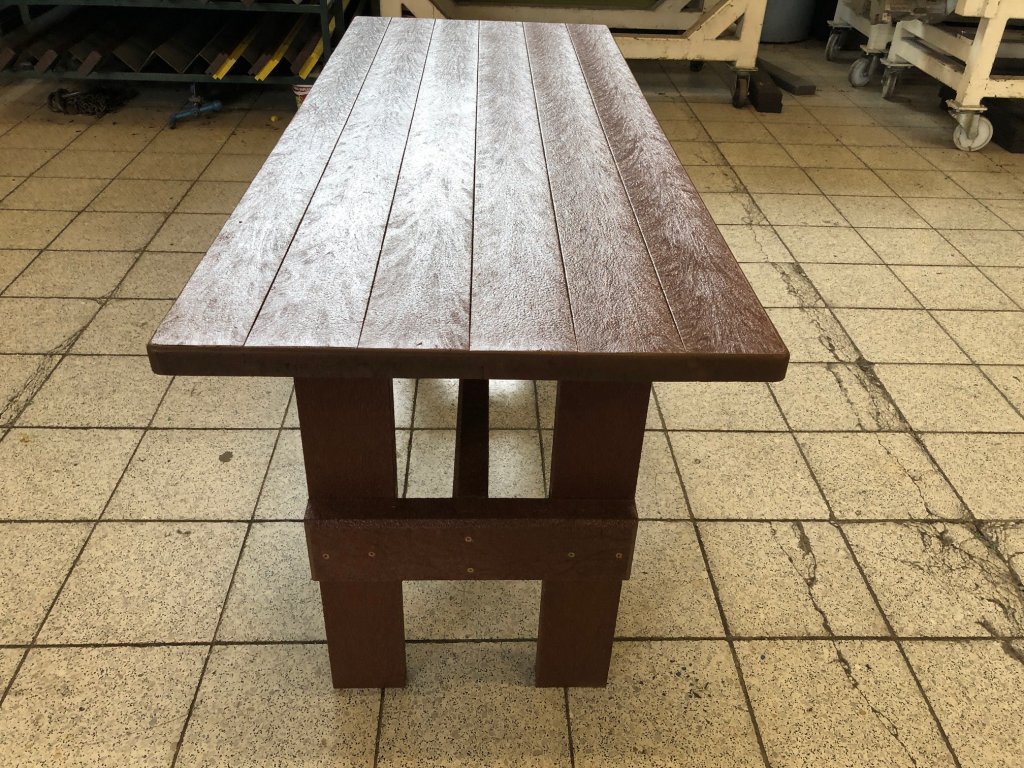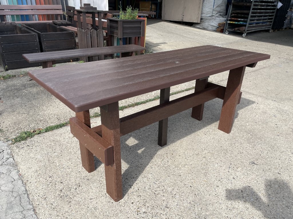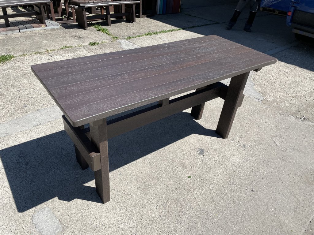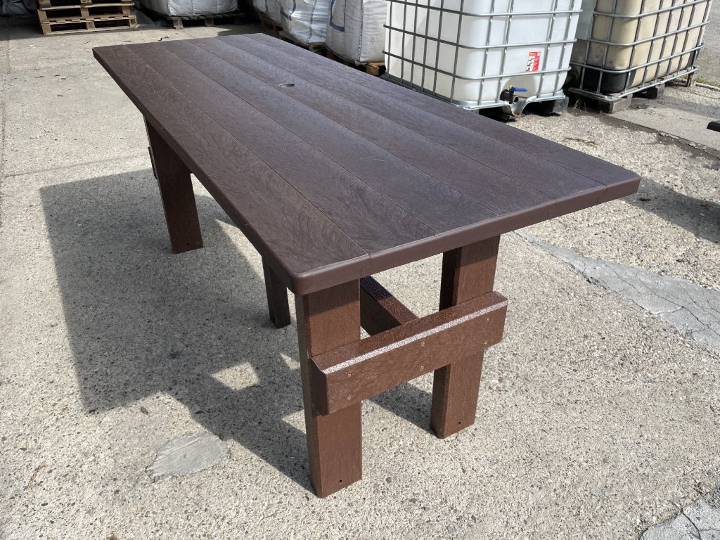 Masívny stôl vyrobený z recyklovaných materiálov, vhodný do každej záhrady, parku, detského ihriska. Má masívne nohy. Je vyrobený z plného, stálofarebného a vodeodolného materiálu. Za príplatok ho vieme vyrobiť v rôznych dĺžkach a rôznych farbách.