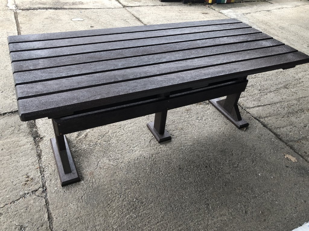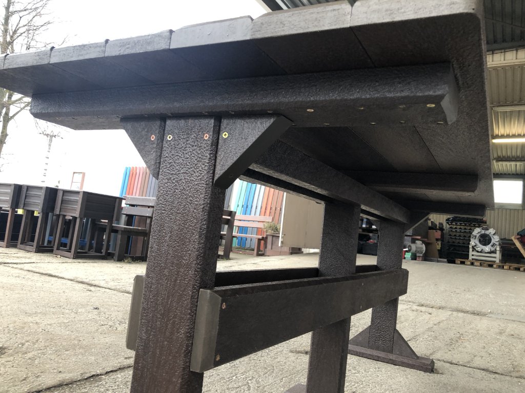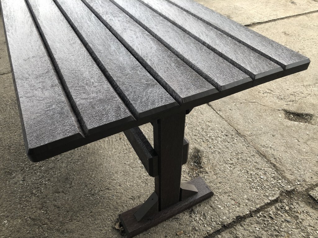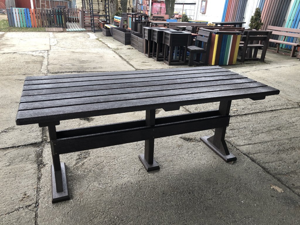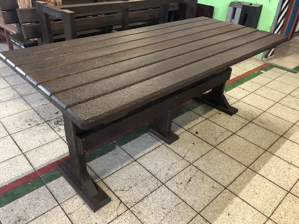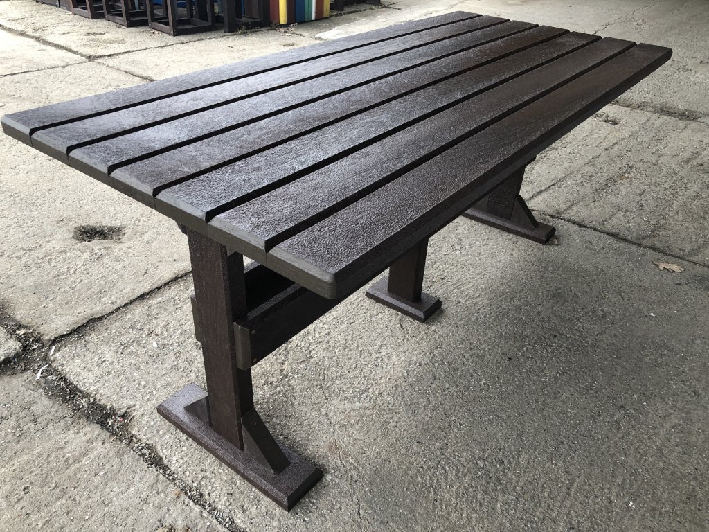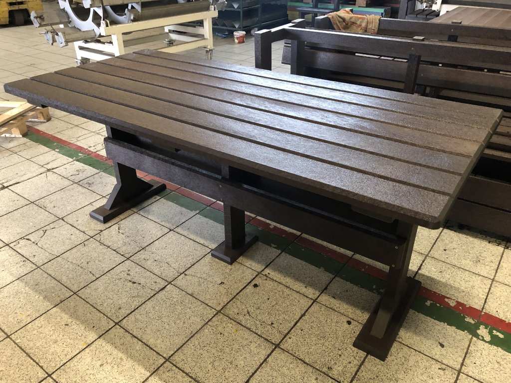 Stôl s podporou na 3 miestach, s upravenými hranami, v hnedej farbe. Je elegantným doplnkom každej záhrady, parku či iných vonkajších priestorov. Materiál je stálofarebný, bezúdržbový, odolný voči poveternostným vplyvom.