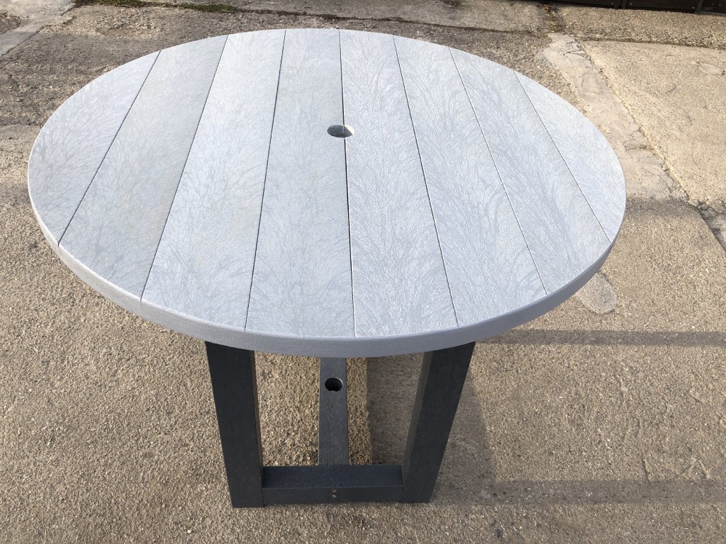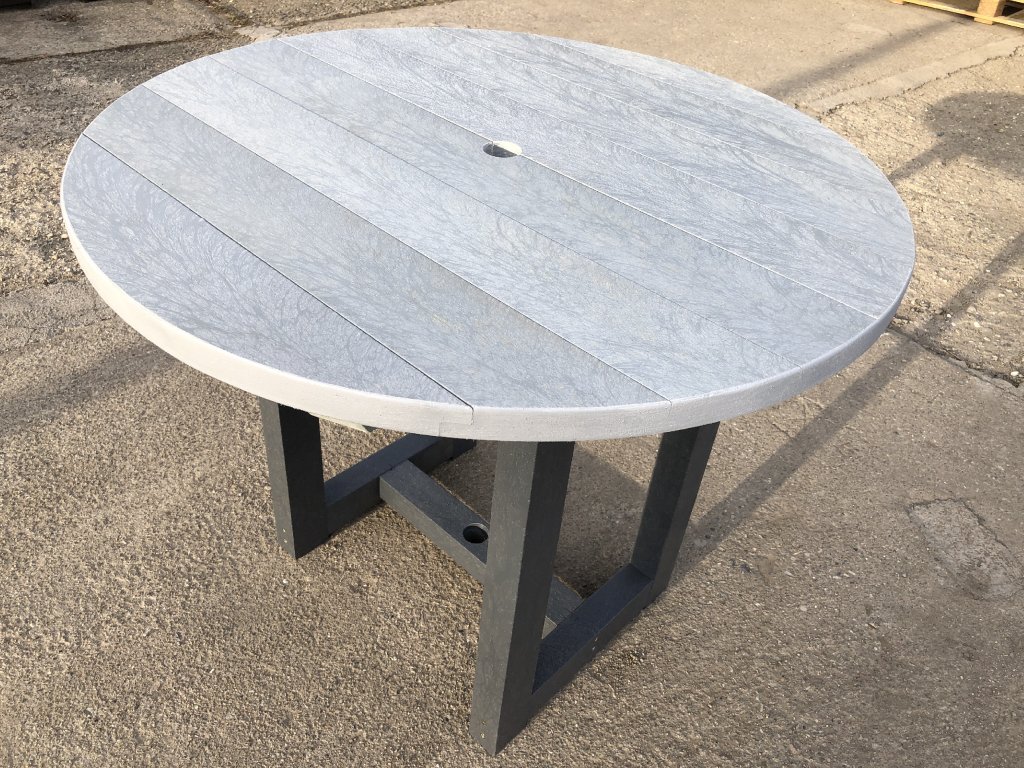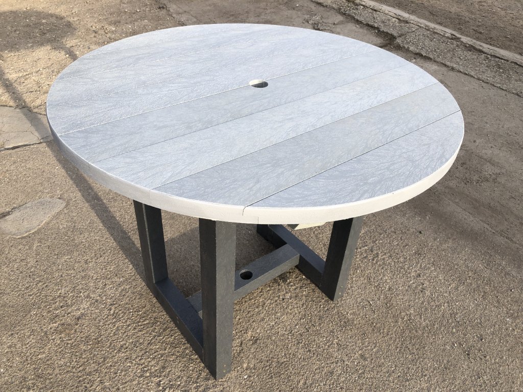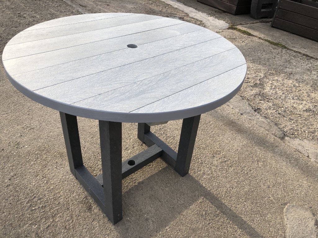Plastový okrúhly stôl v dvoj kombinácii farieb. S možnosťou inštalácie slnečníka. Vhodný ako malý stôl k sedeniu. Výška 70 cm. Materiál je pevný, stálofarebný, bezúdržbový a odolný voči poveternostným vplyvom. Je elegantným doplnkom do záhrad, parkov aj verejných vonkajších priestorov.