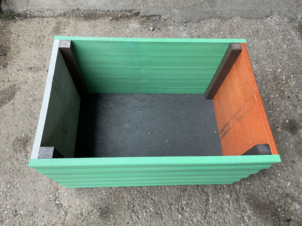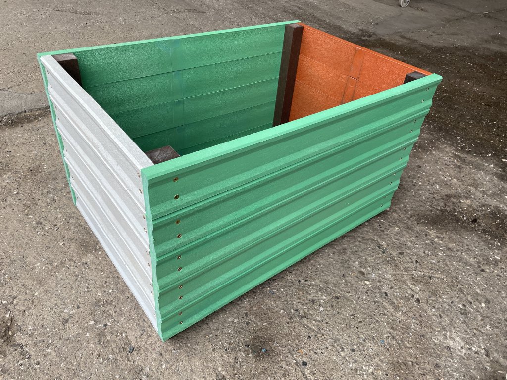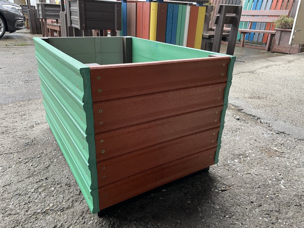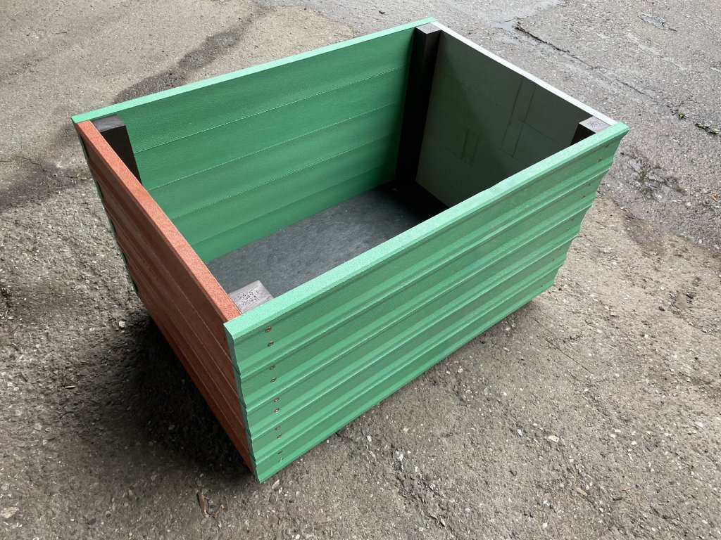 Kvetináč z 2,5 cm hrubých dosiek v hnedej farbe je možné vyrobiť aj iných farebných odtieňoch. Príplatok za farbu je 15 %. Pozostáva z 5 dosiek na sebe, ktoré sú z vnútornej strany spojené hranolčekmi a dno tvorí 2 cm hrubá platňa. Kvetináč je vhodný do záhrad, parkov, na školské dvory. Materiál je pevný, stálofarebný, bezúdržbový a odolný voči poveternostným vplyvom.