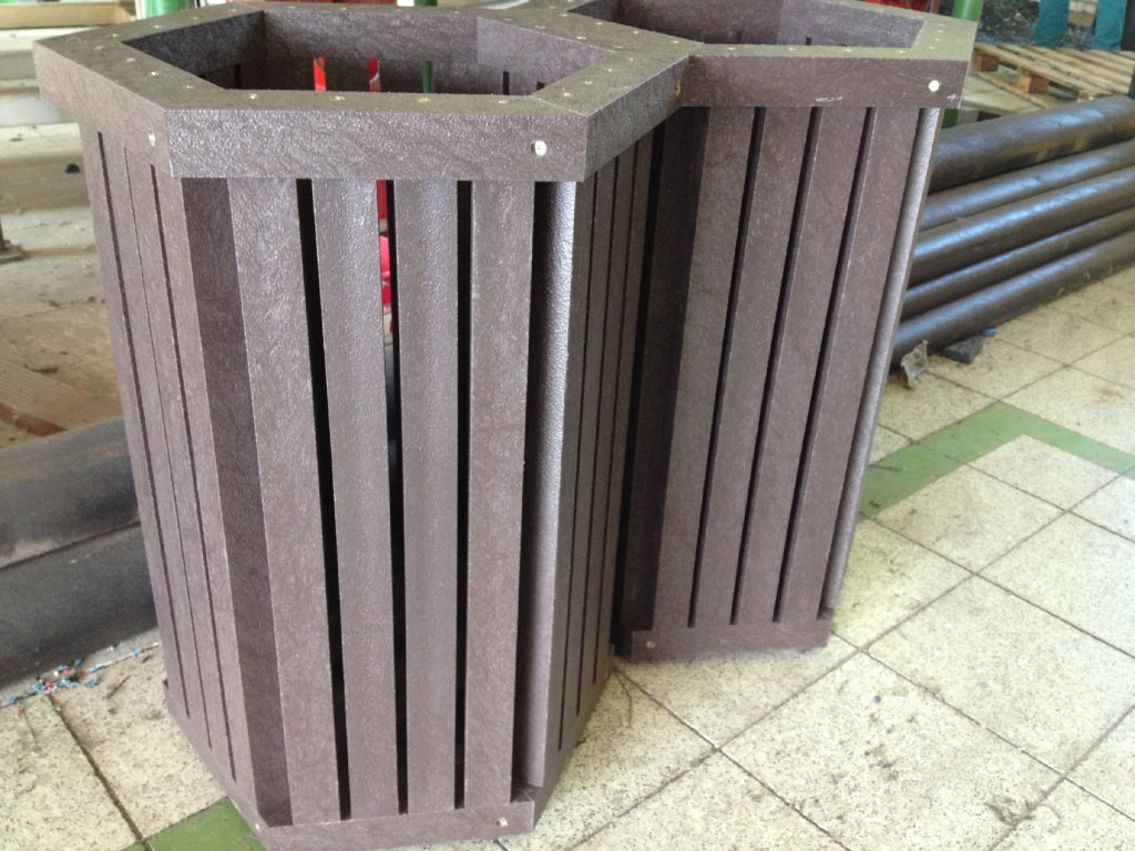 Šesťhranný kôš zložený z hranolov je elegantným riešením exteriérov. Rôzne farebné variácie a možnosti použitia profilov. Vhodný na plastové vrecia - sáčky. Prevažne vyrábaný v dvoch verziách "malý" a "veľký" odpadkový kôš. Je vyrobený z pevného, stálofarebného, bezúdržbového a počasiu odolného materiálu.