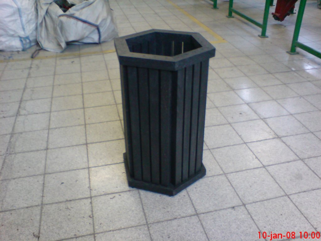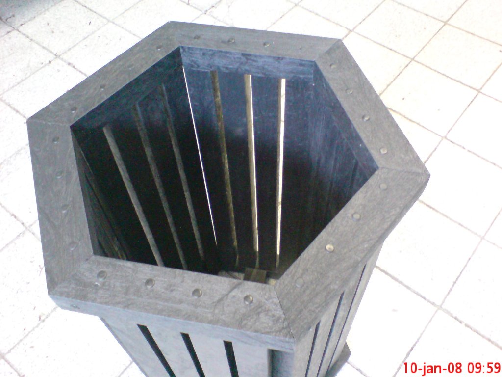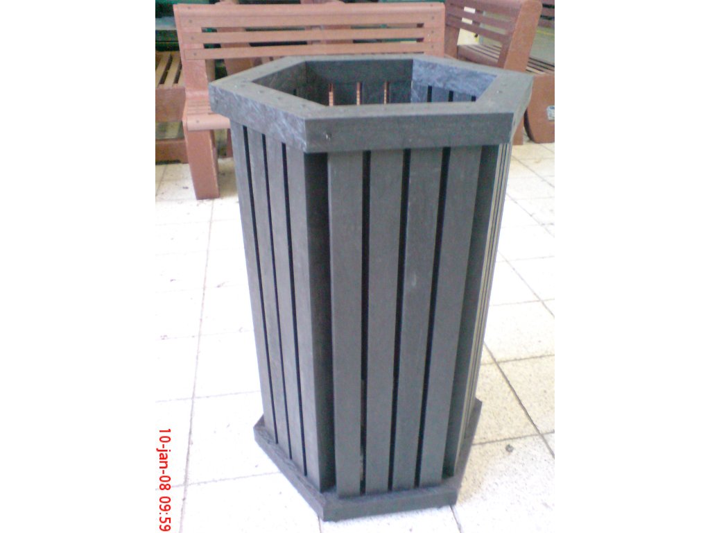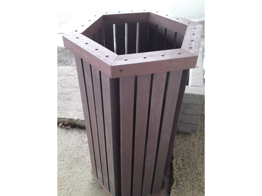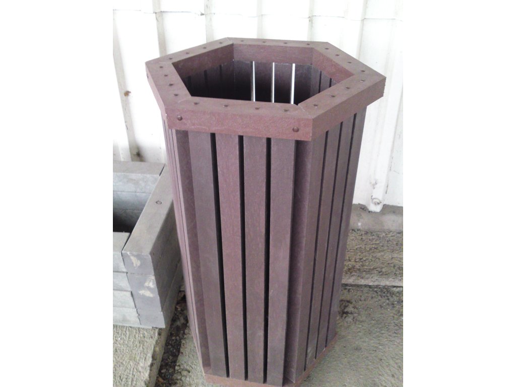 Šesťhranný kôš zložený z hranolov je elegantným riešením exteriérov. Rôzne farebné variácie a možnosti použitia profilov. Vhodný na plastové vrecia - sáčky. Prevažne vyrábaný v dvoch verziách "malý" a "veľký" odpadkový kôš. Je vyrobený z pevného, stálofarebného, bezúdržbového a počasiu odolného materiálu.