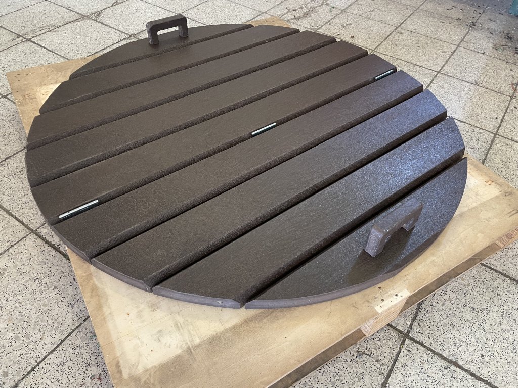 Okrúhly poklop vyrábame aj na mieru, napr. pre odber vzoriek vody a podobne. Rozmerom sa vieme prispôsobiť. Prevažne vyrábame od 35 až 180 cm priemer. Poklop vieme pripraviť aj s odnímateľnou, alebo otváracou časťou pomocou pántov, prípadne s rúčkou na uchytenie v rôznych farbách.