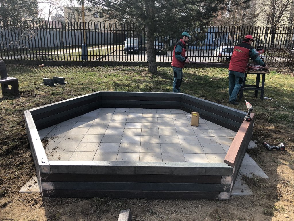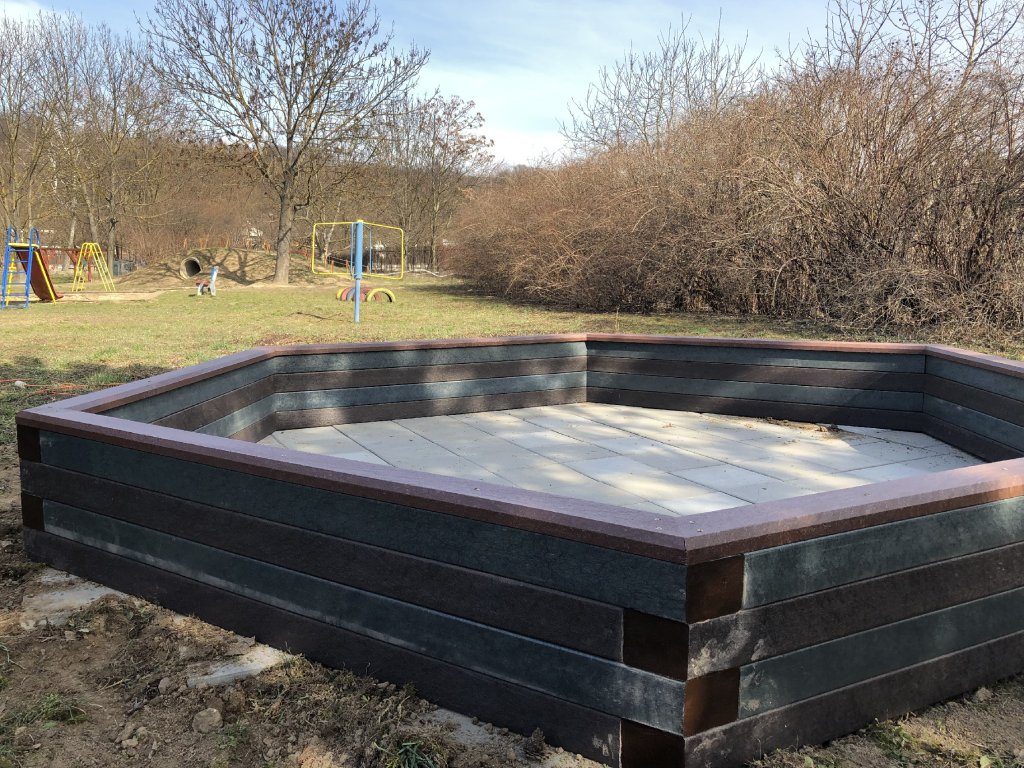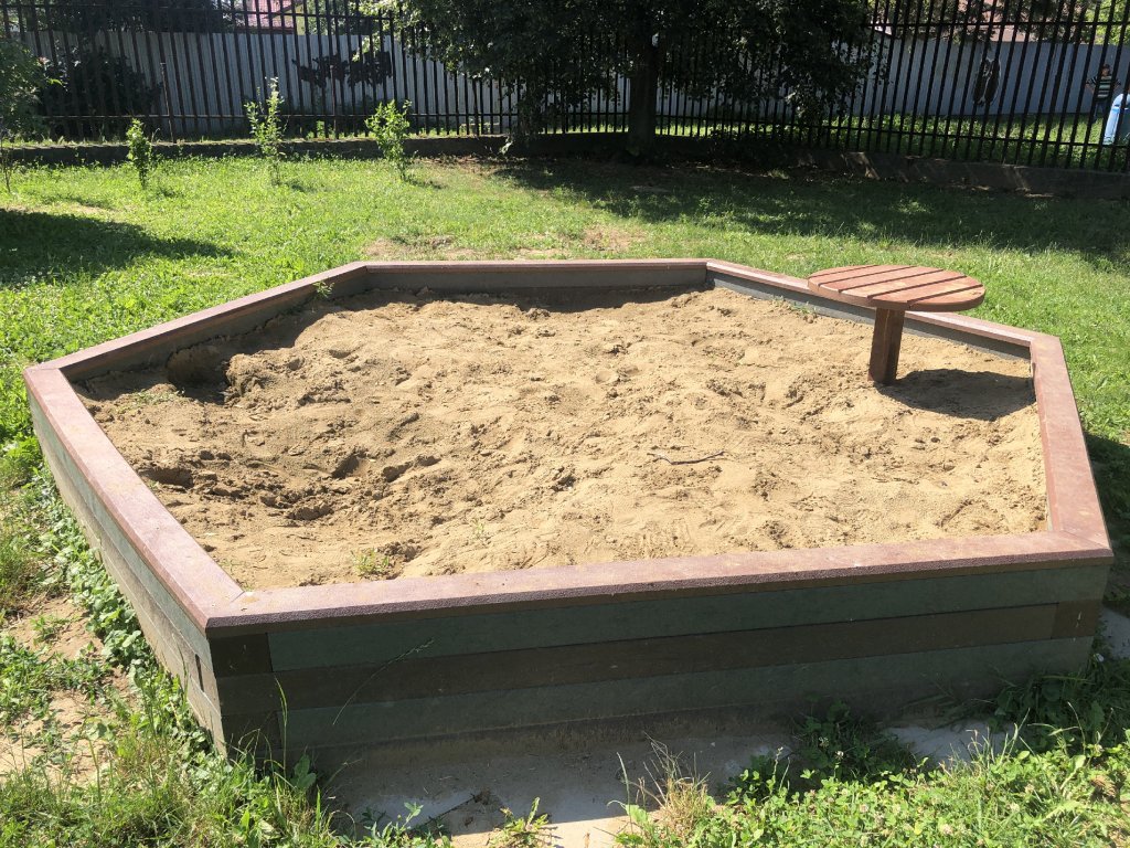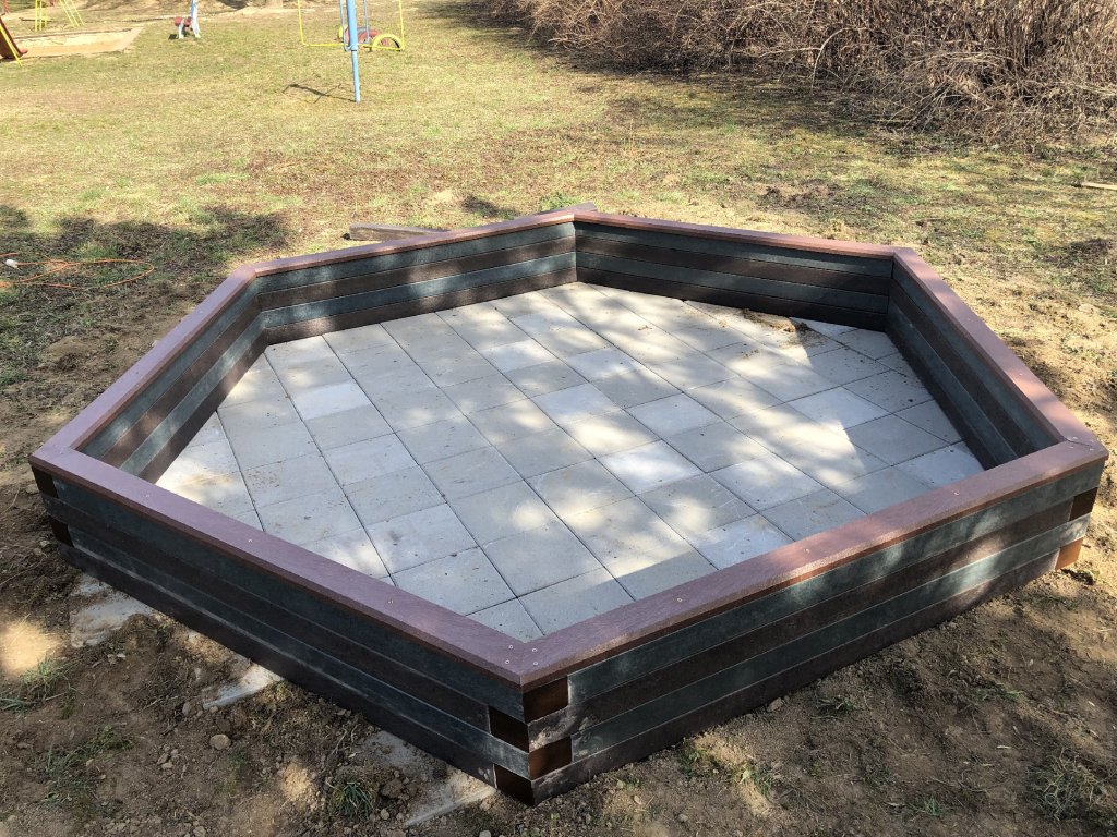 Pieskovisko šesťhran. Hranolčeky 9x9 cm, dĺžka steny 140 cm, na mieru, výška 30 cm.