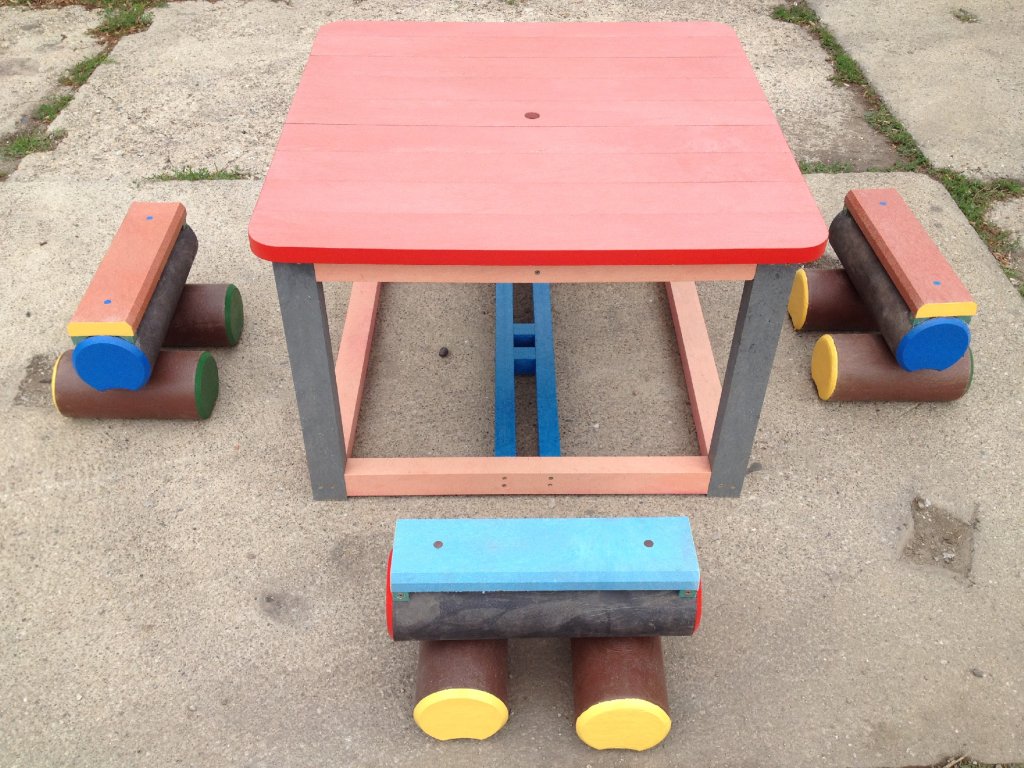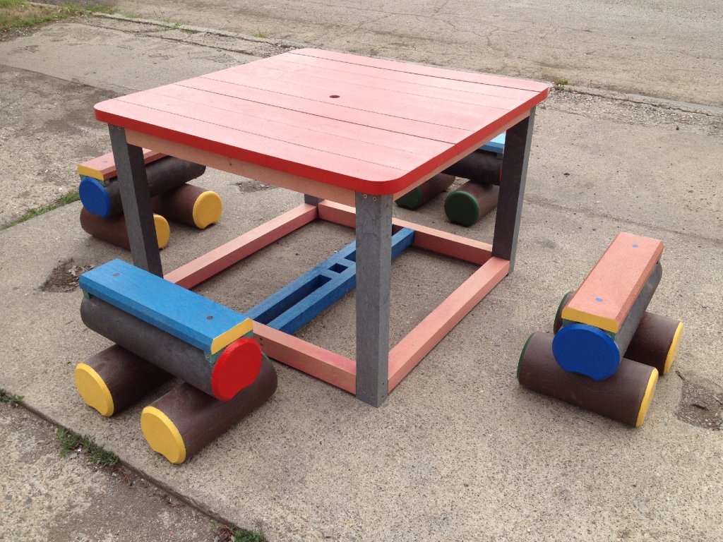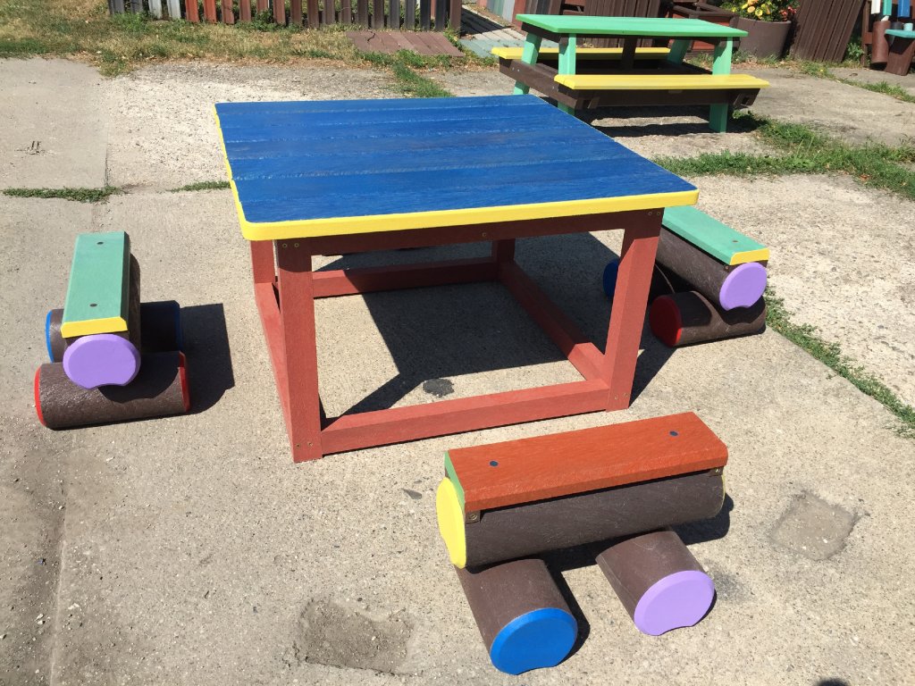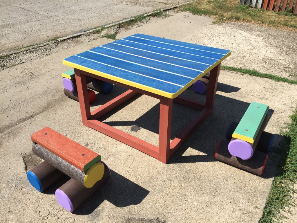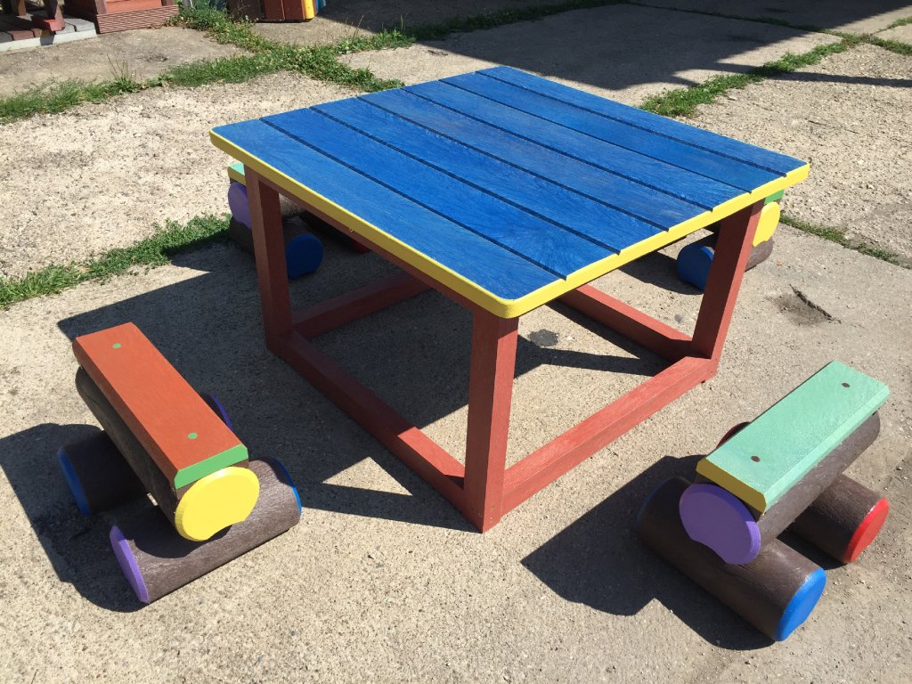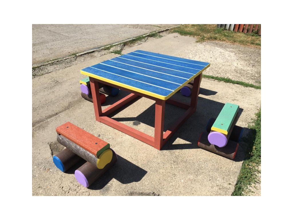 Malý stôl s rozmerom približne 100 x 100 cm a k nemu malé kladinky sú veselým doplnkom každého školského dvora. Na výber je pestrá paleta farieb. Sú vyrobené z pevného, stálofarebného, bezúdržbového a počasiu odolného materiálu.