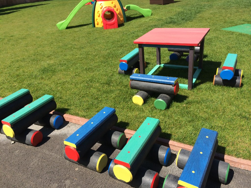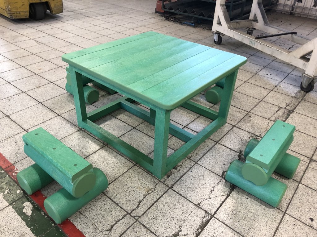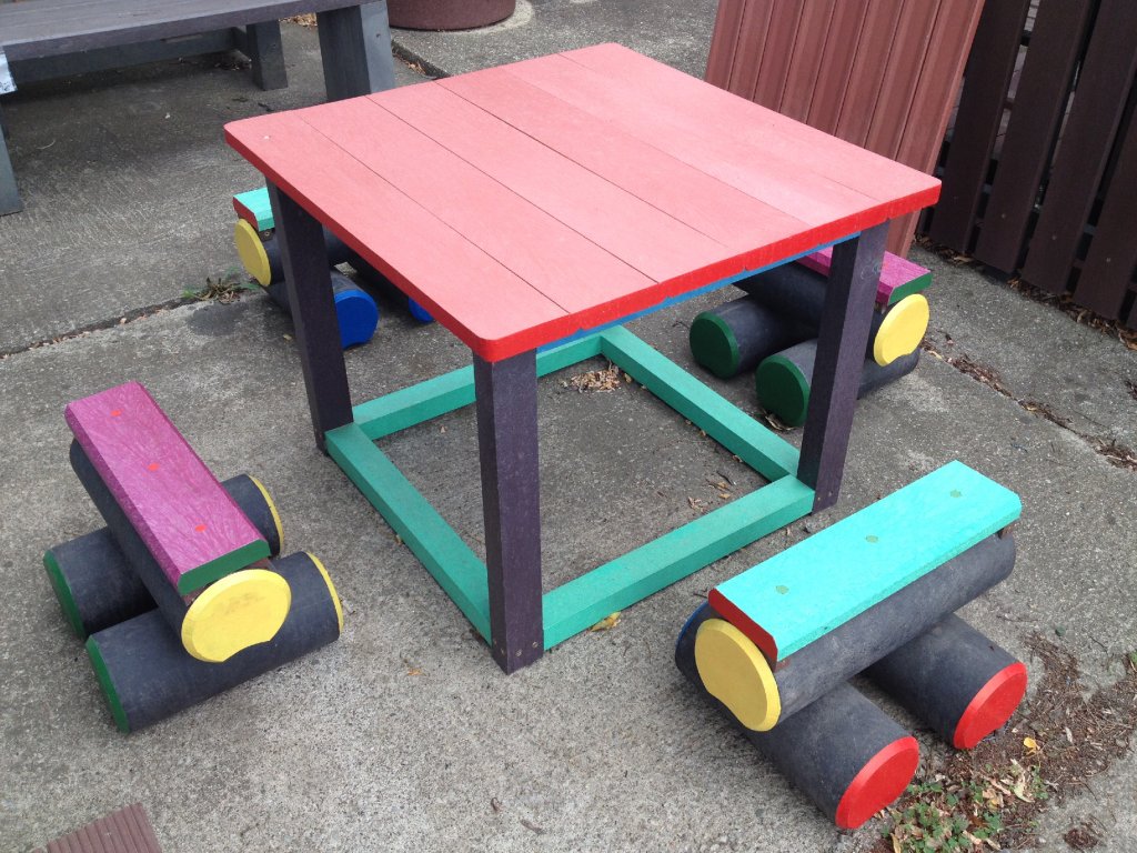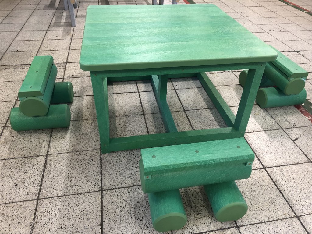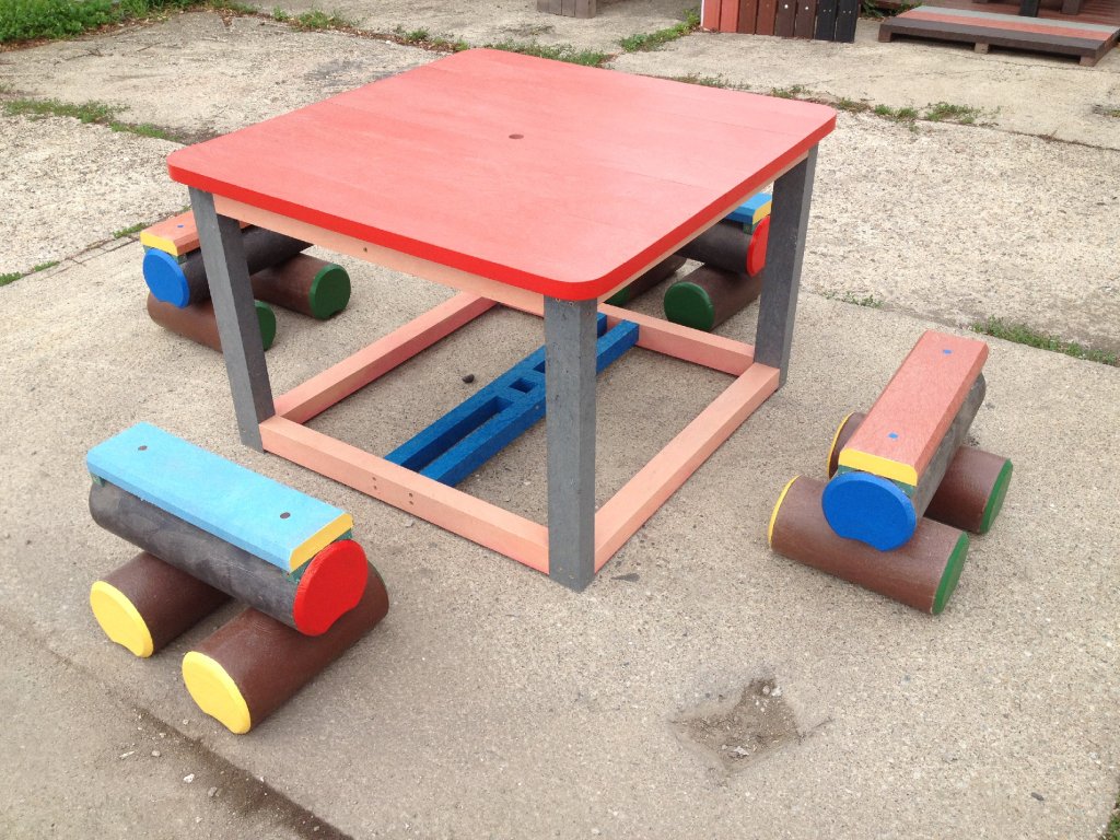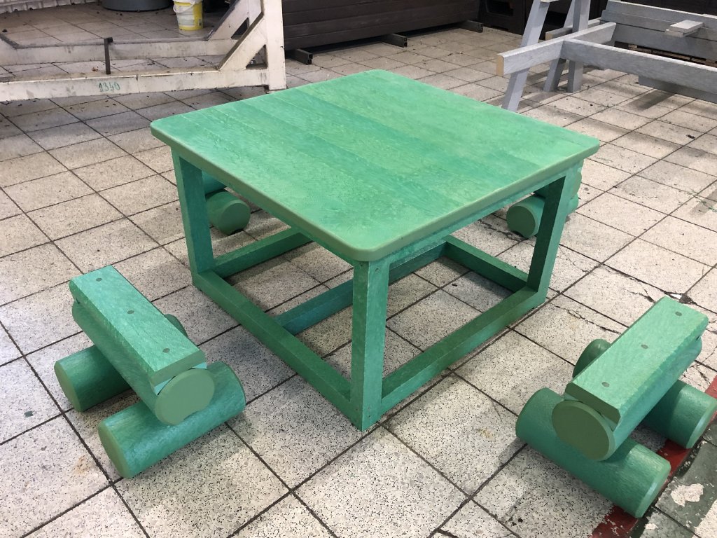 Malý stôl s rozmerom približne 100 x 100 cm a k nemu malé kladinky sú veselým doplnkom každého školského dvora. Na výber je pestrá paleta farieb. Sú vyrobené z pevného, stálofarebného, bezúdržbového a počasiu odolného materiálu.