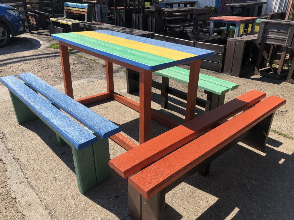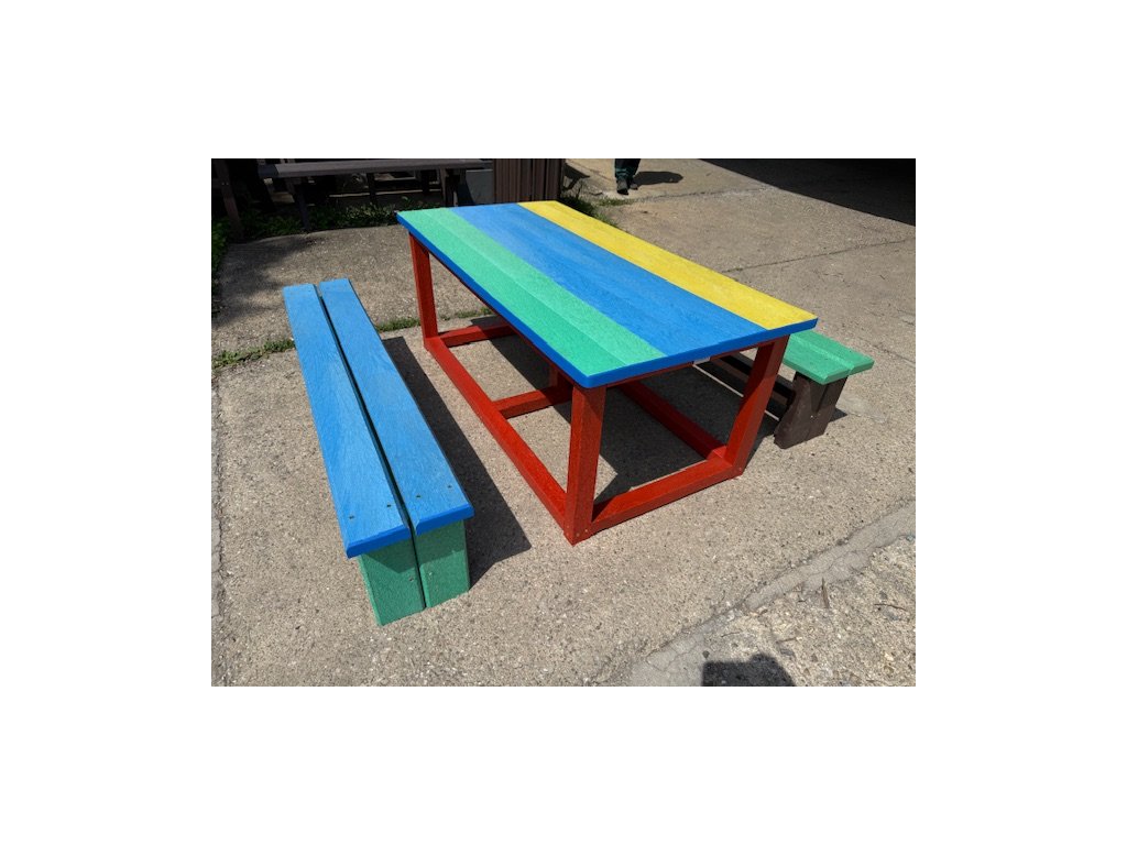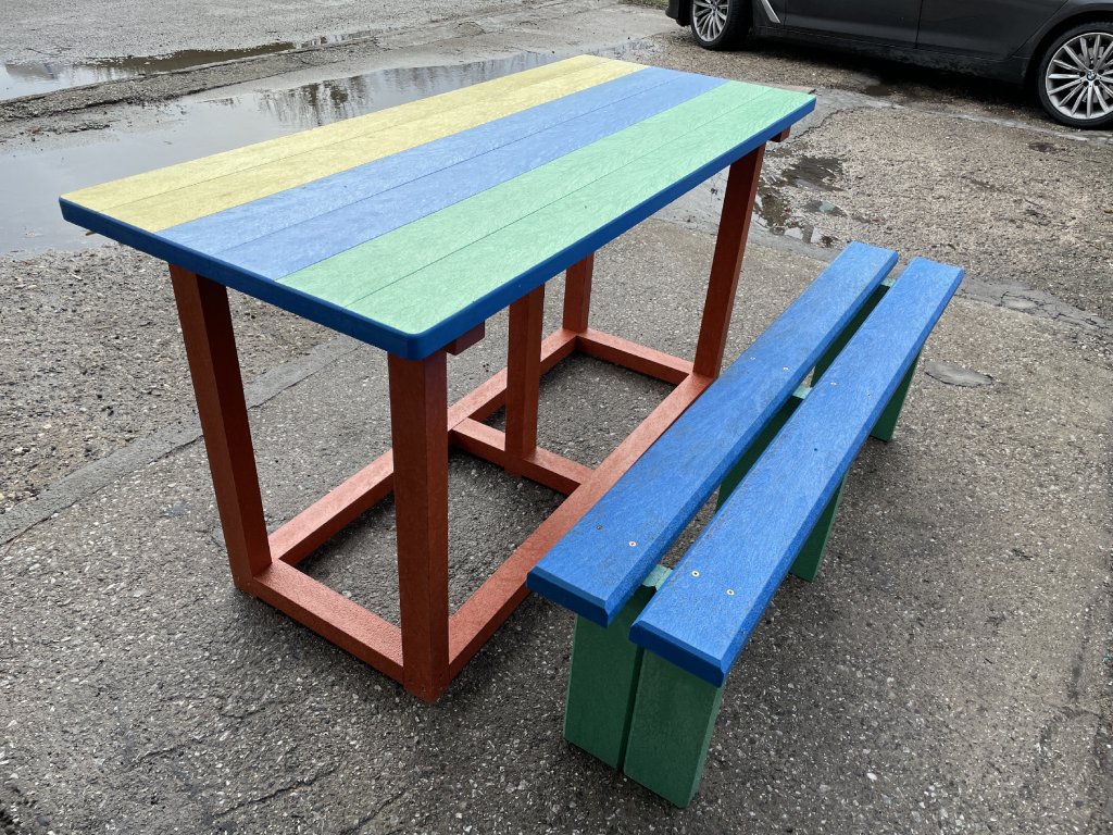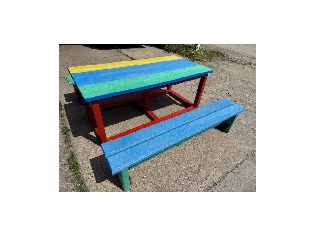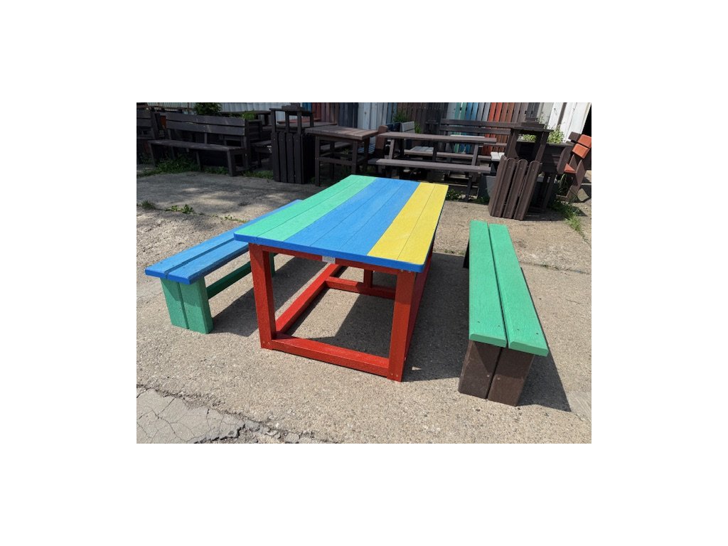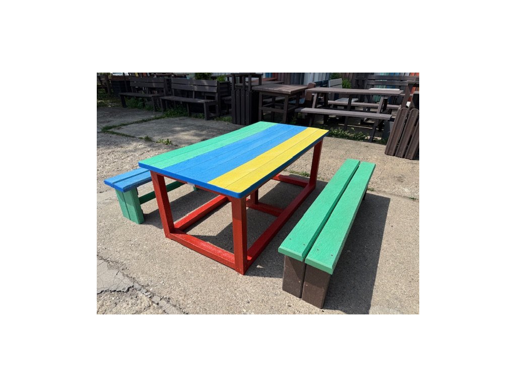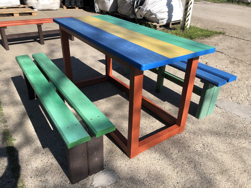 Detská sada pozostáva z obdĺžnikového stola a dvoch lavičiek. Sada je vyrobená z pevného, odolného, bezúdržbového a počasiu odolného materiálu. Vhodná do parkov, záhrad alebo do škôlok a škôl, kde je materiál viac namáhaný.