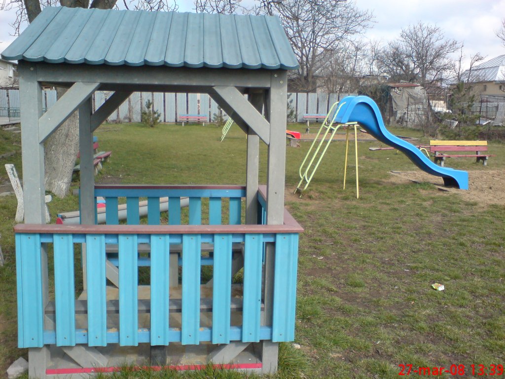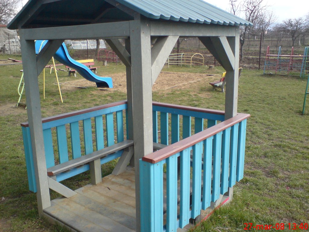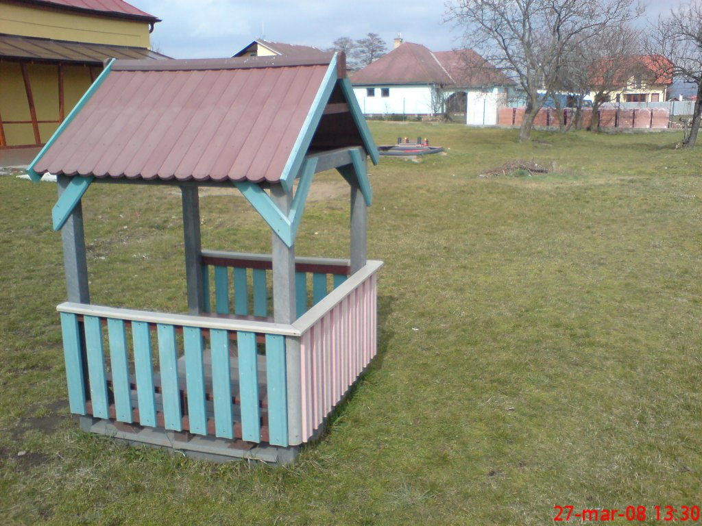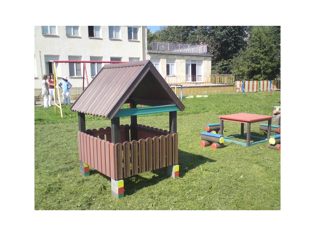 Malý detský domček alebo altánok je vhodným spestrením školského dvora. Je možné ho vyrobiť na viacero spôsobov napríklad aj s podlahou a lavicami vo vnútri, strechou, v rôznych farebných a rozmerových variantách. Materiál je pevný, stálofarebný, bezúdržbový a odolný voči poveternostným vplyvom.
