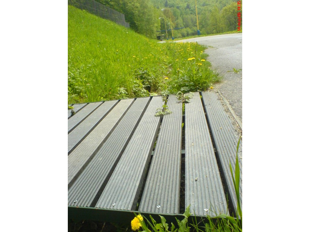 Profil č. 19, uvedený v cenníku profilov D-120x40-2200 ( š x h x d ) v mm používame ako protišmykovú dosku vhodnú na podlahu, terasu alebo aj priamo na staré betónové schodisko. Moderný, protišmykový profil dosky má dĺžku až 220 cm a pri ukotvení hranolom H-70x50-2000 je možné vyrobiť podlahu s rozlohou 4,4m2 čo postačuje na osadenie dvoch lavičiek a stola. Veľmi jednoducho a lacno si vieme pripraviť hotovú podlahu ku našim záhradám, terasám, sedeniam bez použitia nákladných stavebných úprav, výkopových prác. Ak použijeme podlahu na trávnatý povrch, stačí ju vypodložiť textíliou proti prerastaniu trávy a môže sa ihneď používať. Rovný profil vytvorí hladkú plochu, č. 06, D-130x30-2000 je taktiež elegantný s jednoduchou montážou, alebo perodrážka so šírkou 11 cm po založení "do seba" vytvorí rovnú podlahu, alebo plochu napr. aj na vrch-plát stola. Dosky vyrábame a predávame po kusoch. Vieme vyrobiť aj hotové platne s rozmerom napr. 110 x 60 cm vhodné ako pochôdzne platne - podesty, prípadne v rozmeroch "na mieru", v rôznych farbách a dĺžkach. Je vyrobený z pevného, stálofarebného, bezúdržbového a počasiu odolného materiálu.