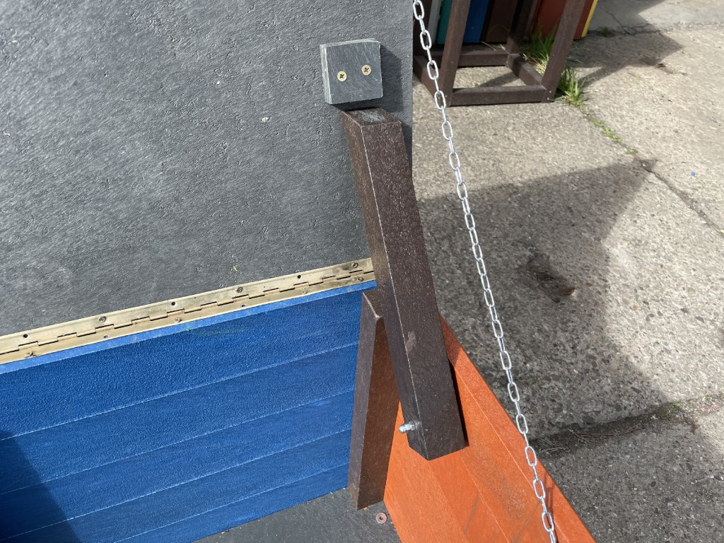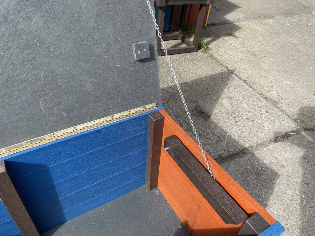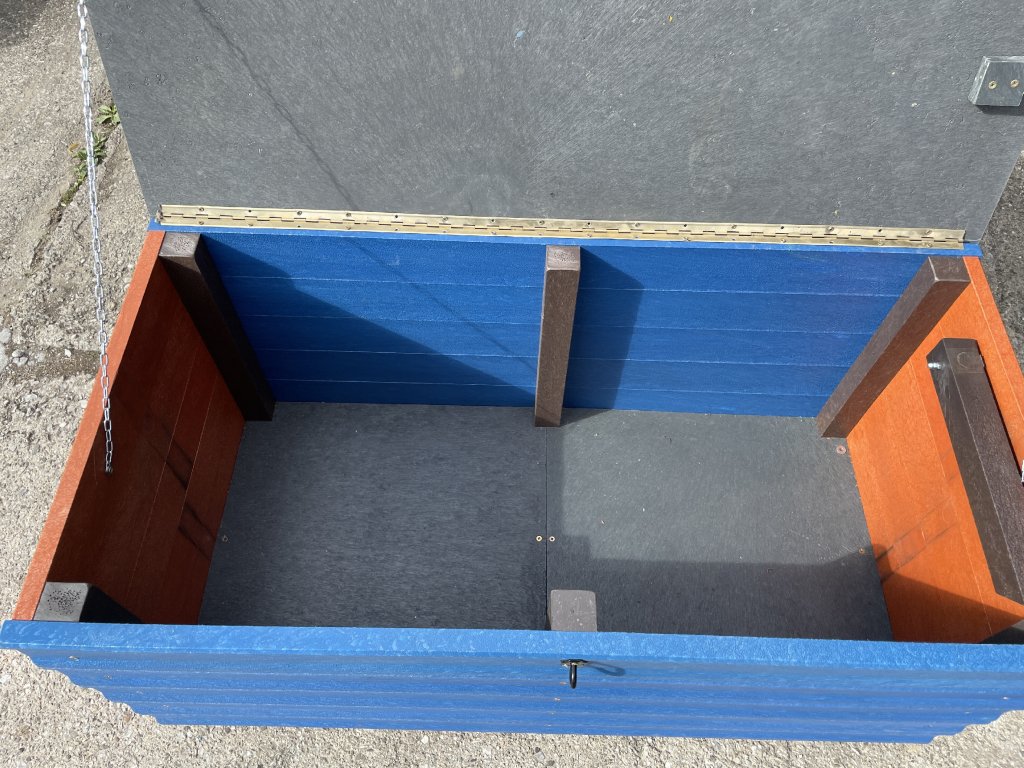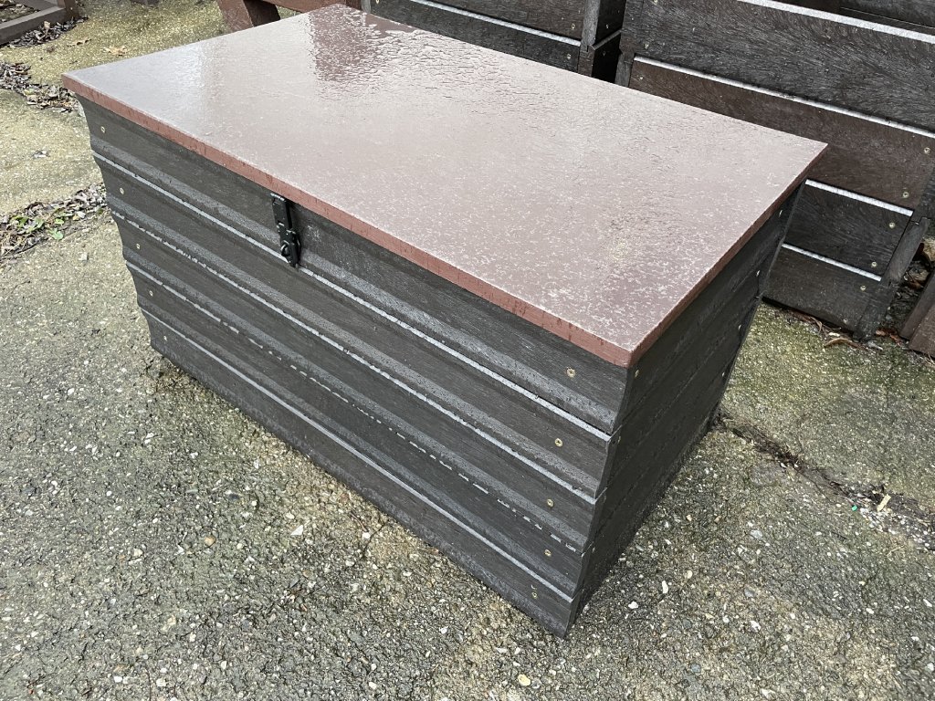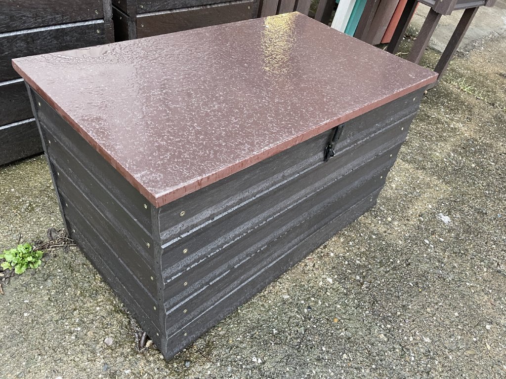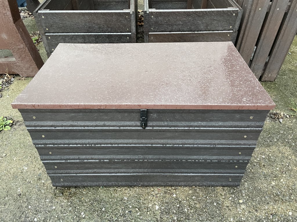 Plastový box z 2,5 cm hrubých dosiek s 2 cm hrubou platňou na spodku a vrchu je vystužený z vnútornej strany hranolčekmi. Je vhodný na odkladanie vecí hlavne v exteriéri, pretože je vyrobený z pevného, stálofarebného, bezúdržbového a počasiu odolného materiálu. Je možné ho vyrobiť aj v iných farebných kombináciách za príplatok 15 % z ceny hnedého.