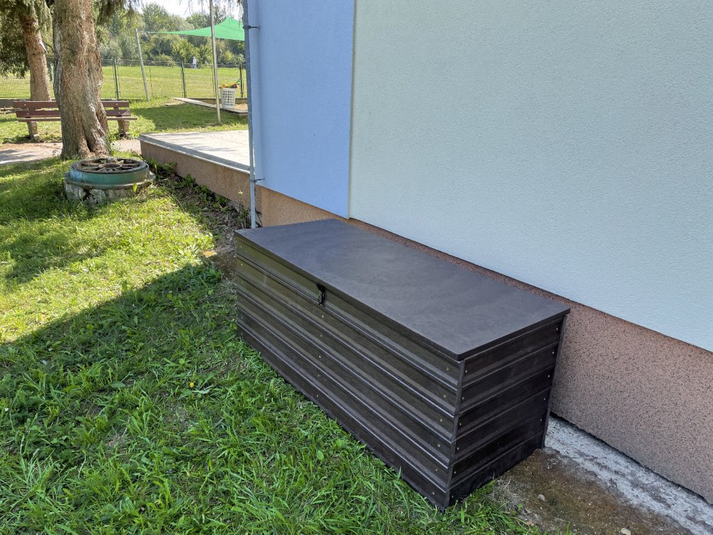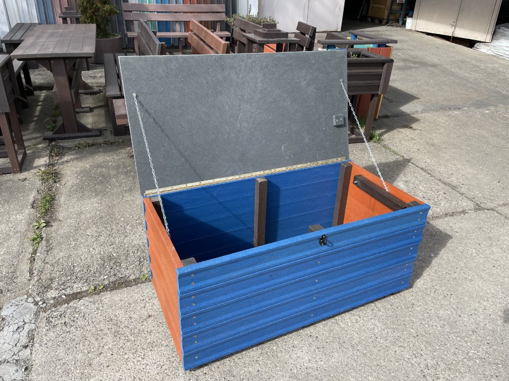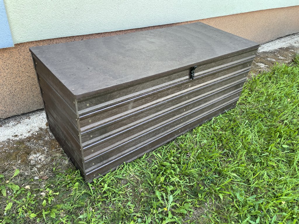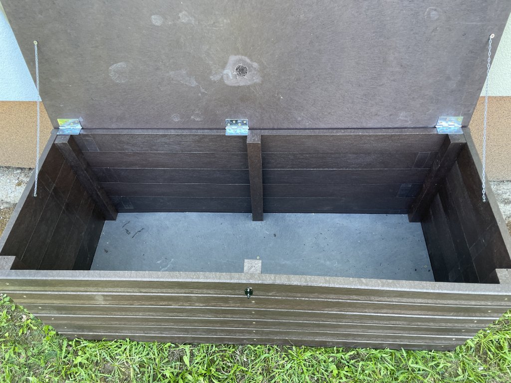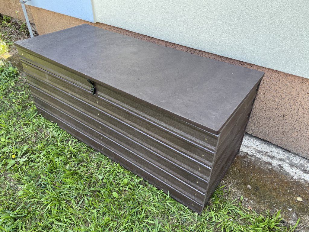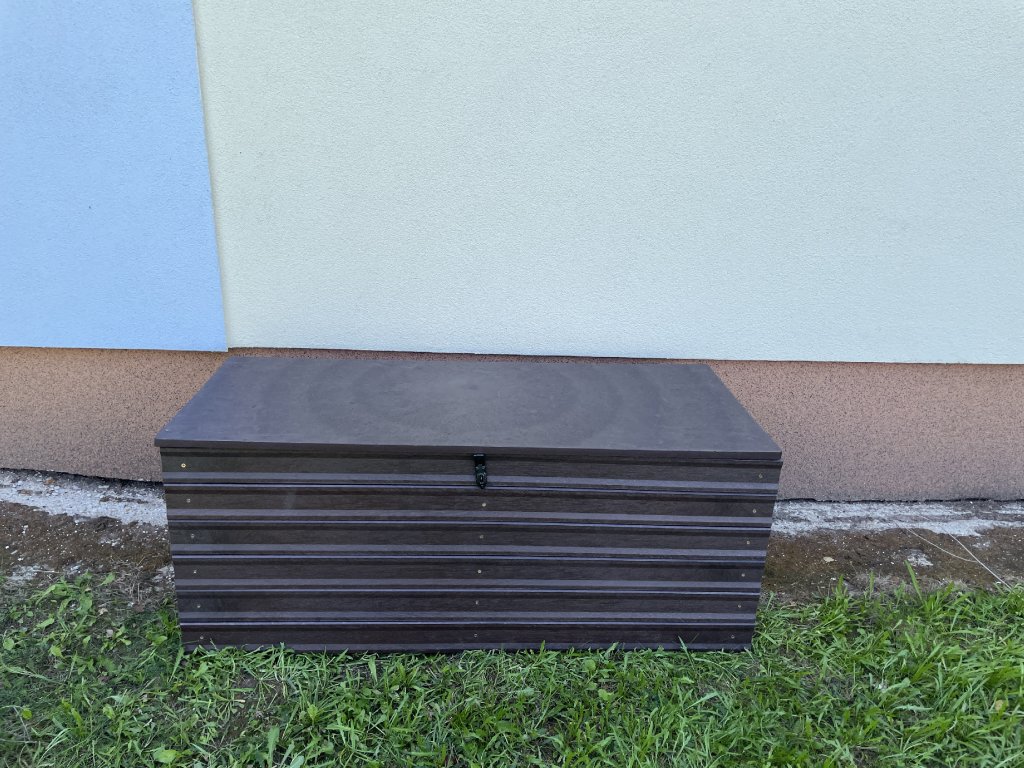 Plastový box z 2,5 cm hrubých dosiek s 2 cm hrubou platňou na spodku a vrchu je vystužený z vnútornej strany hranolčekmi. Je vhodný na odkladanie vecí hlavne v exteriéri, pretože je vyrobený z pevného, stálofarebného, bezúdržbového a počasiu odolného materiálu. Je možné ho vyrobiť aj v iných farebných kombináciách za príplatok 15 % z ceny hnedého.