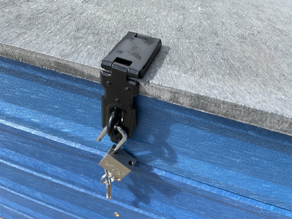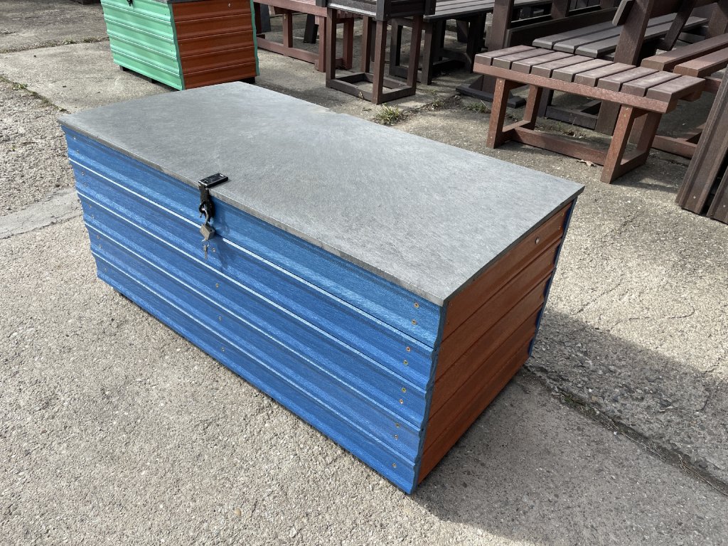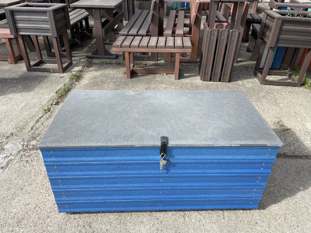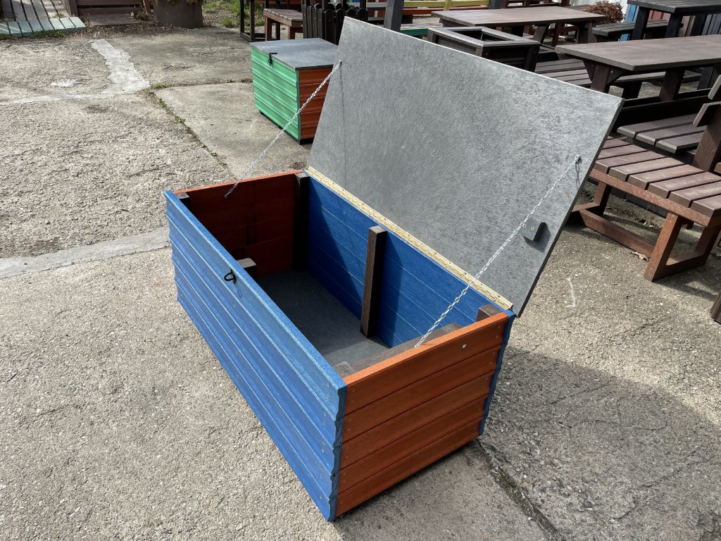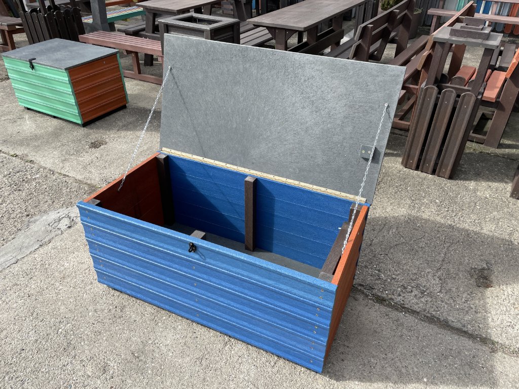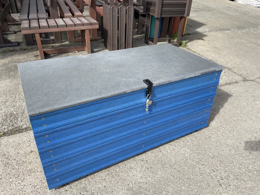 Plastový box z 2,5 cm hrubých dosiek s 2 cm hrubou platňou na spodku a vrchu je vystužený z vnútornej strany hranolčekmi. Je vhodný na odkladanie vecí hlavne v exteriéri, pretože je vyrobený z pevného, stálofarebného, bezúdržbového a počasiu odolného materiálu. Je možné ho vyrobiť aj v iných farebných kombináciách za príplatok 15 % z ceny hnedého.