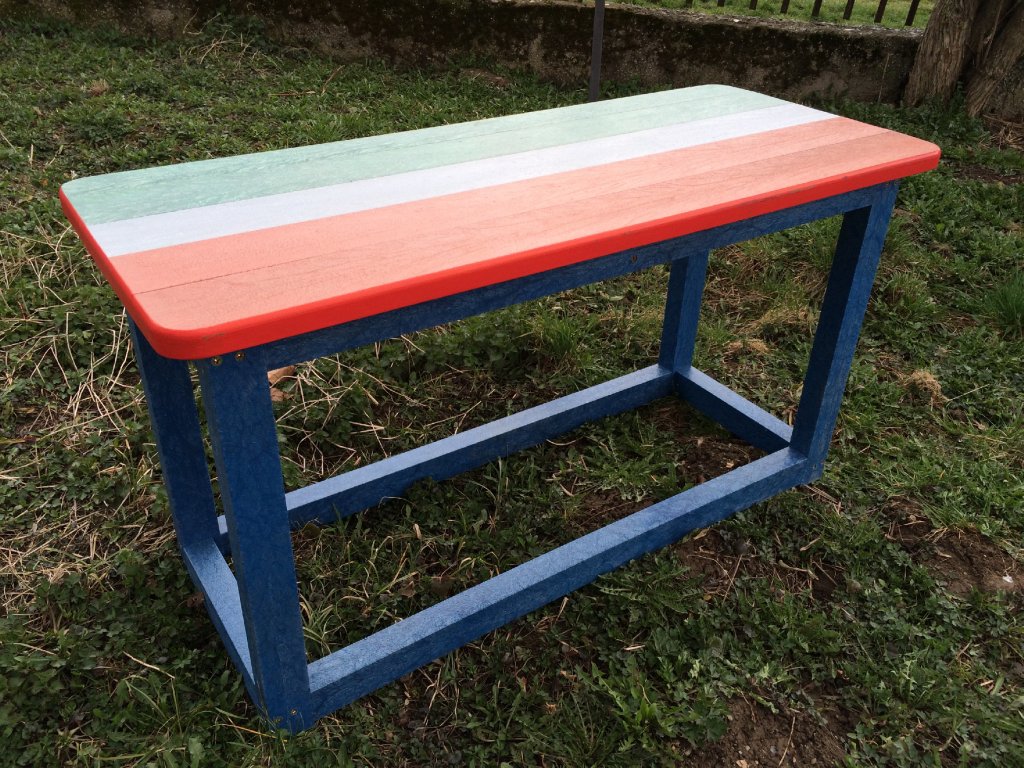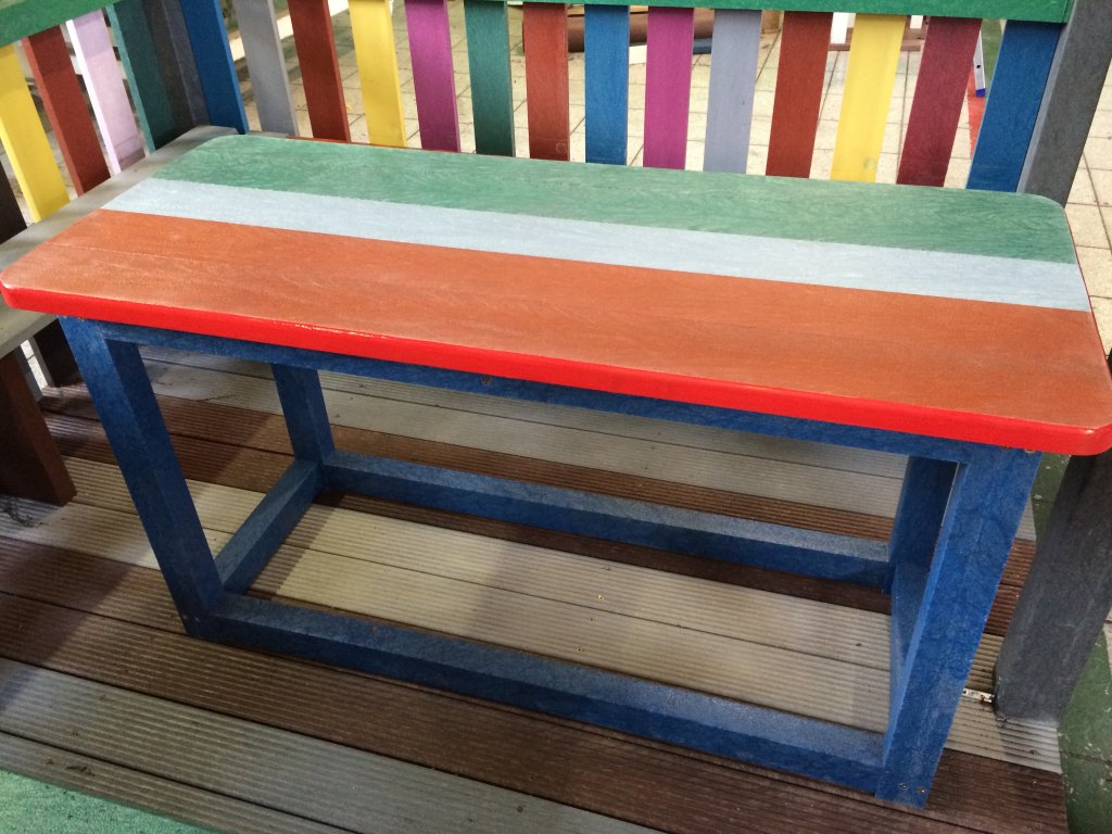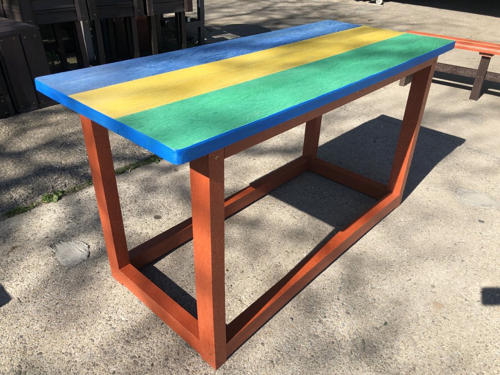 Bunter Kindertisch aus strapazierfähigem Material, wartungsfrei, farbstabil, für jedes Wetter geeignet. Mögliche Farbgestaltung nach Kundenwunsch.