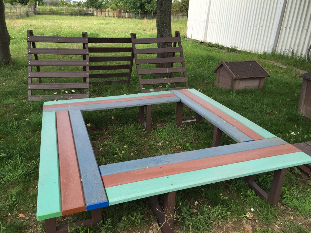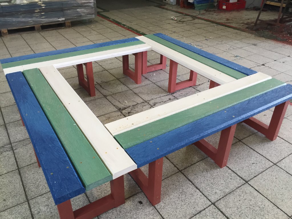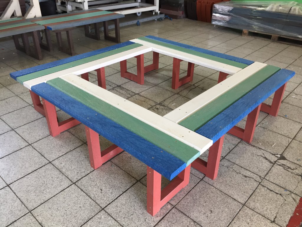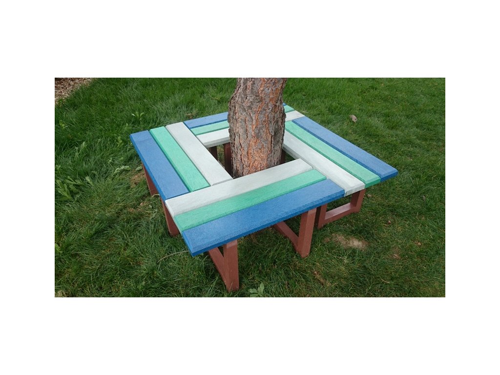 Die Sitzgelegenheit rund um den Baum besteht aus vier verbundenen Bänken in der benötigten Größe. Bänke können aus Brettern ohne Rückenlehne oder mit Rückenlehne aus verschiedenen unserer Profile in verschiedenen Farbkombinationen bestehen.