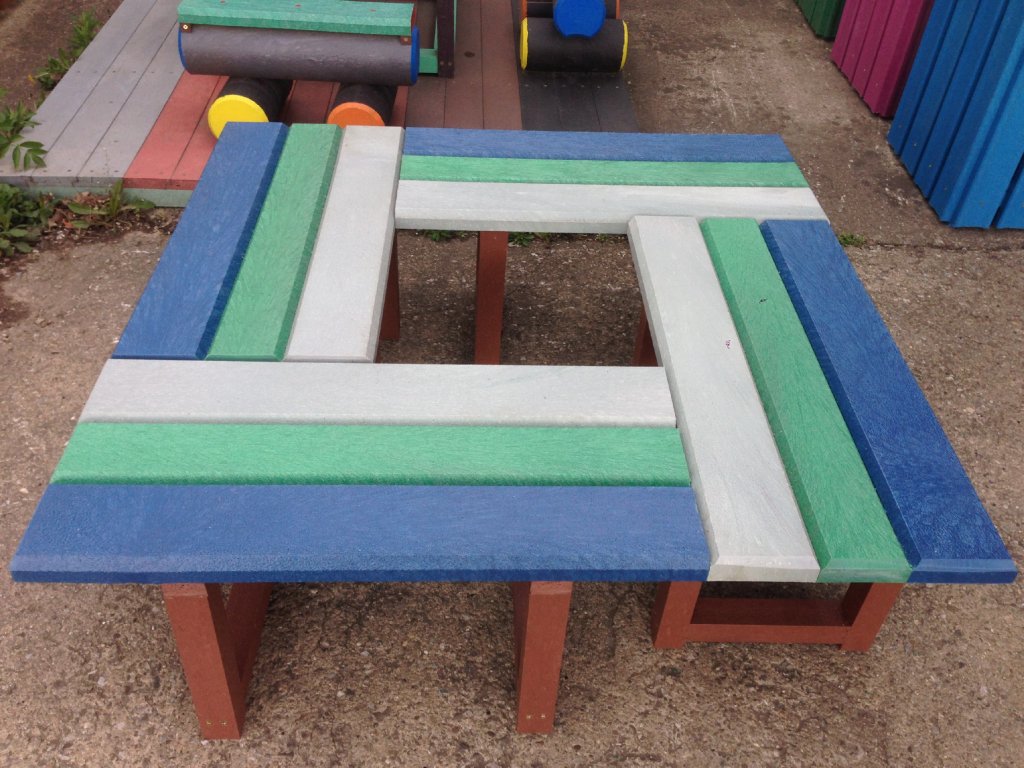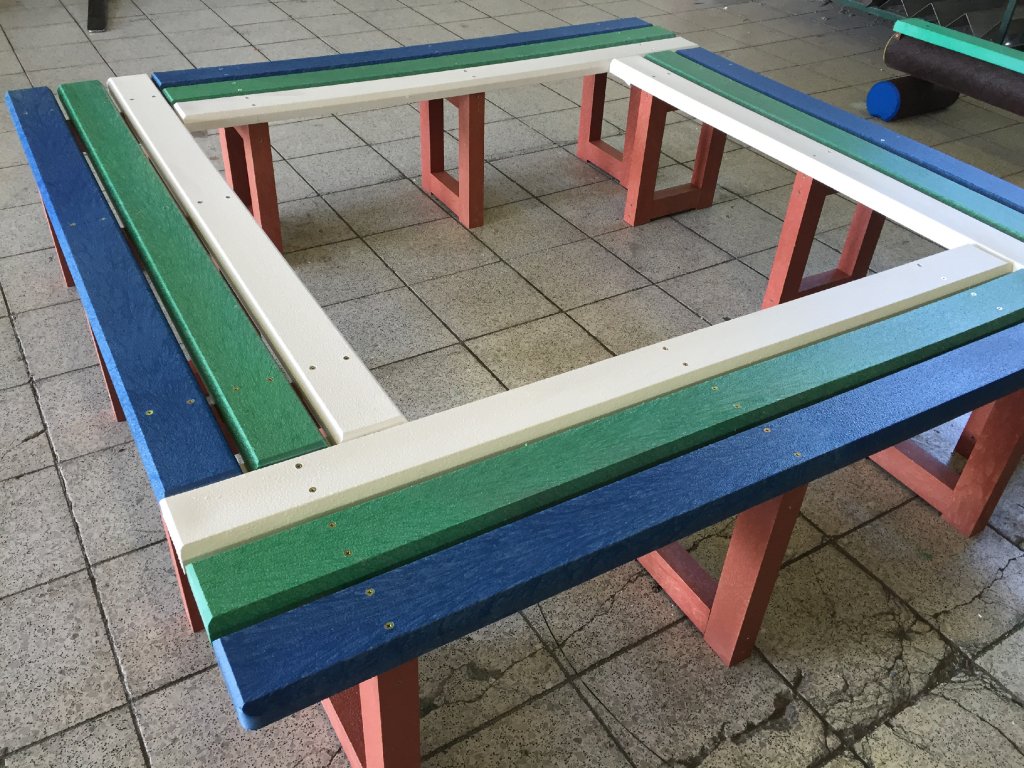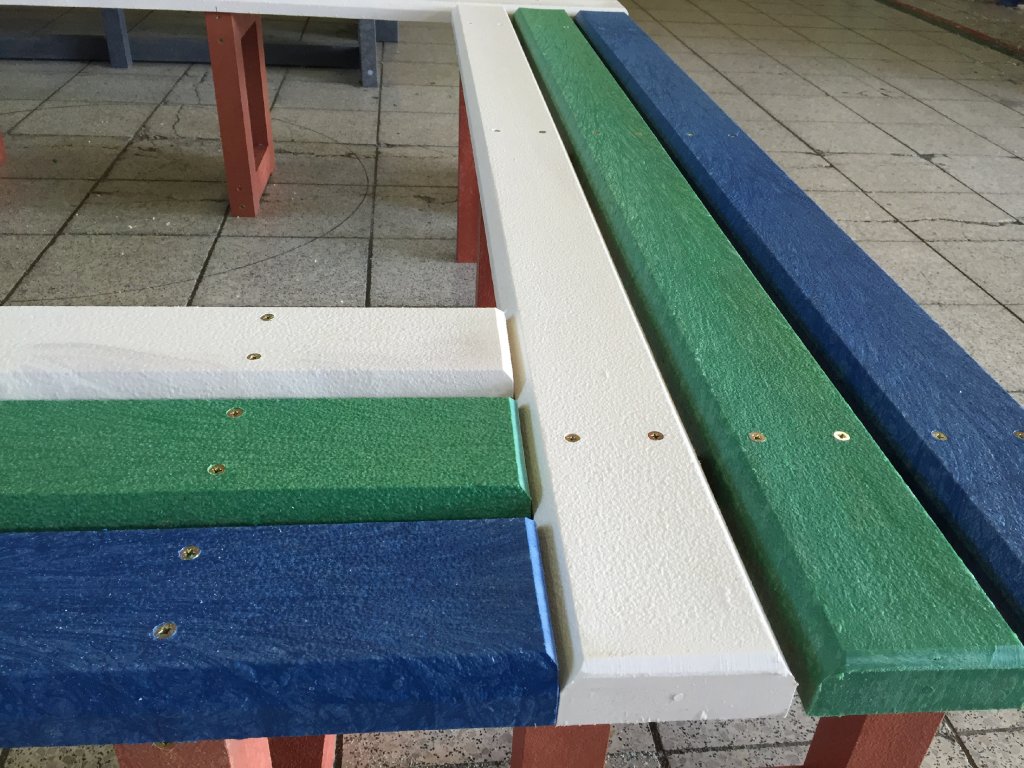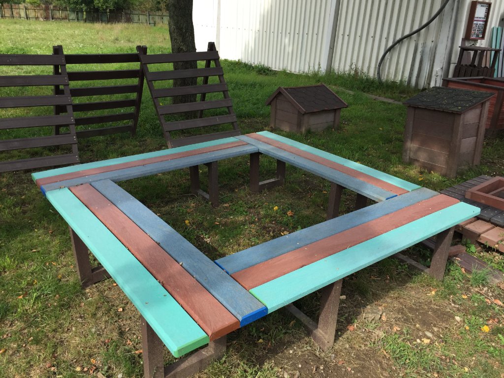 Die Sitzgelegenheit rund um den Baum besteht aus vier verbundenen Bänken in der benötigten Größe. Bänke können aus Brettern ohne Rückenlehne oder mit Rückenlehne aus verschiedenen unserer Profile in verschiedenen Farbkombinationen bestehen.