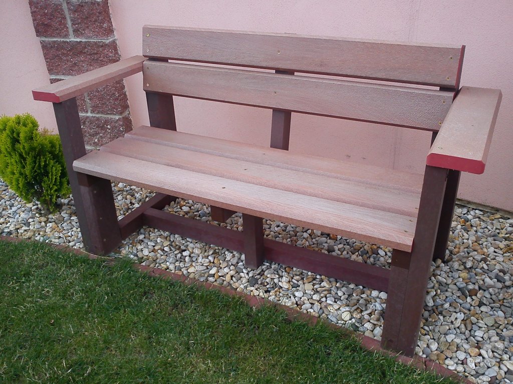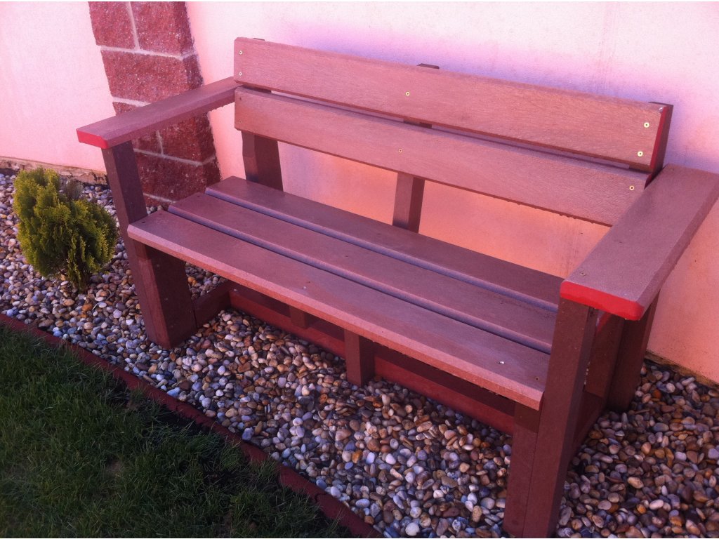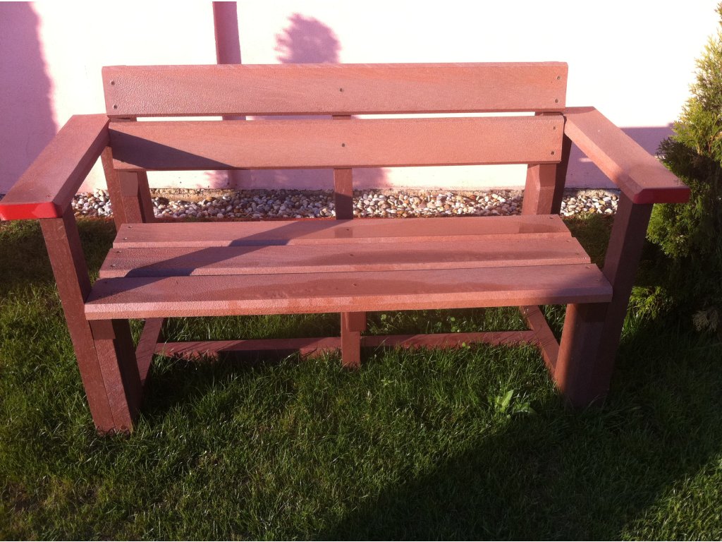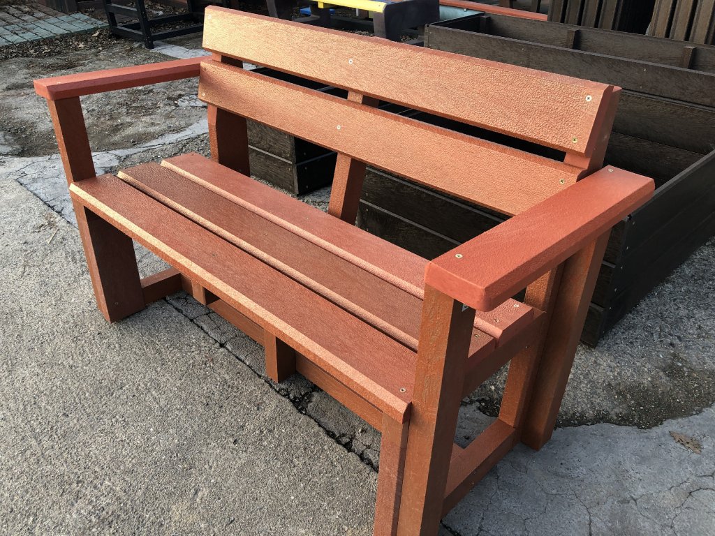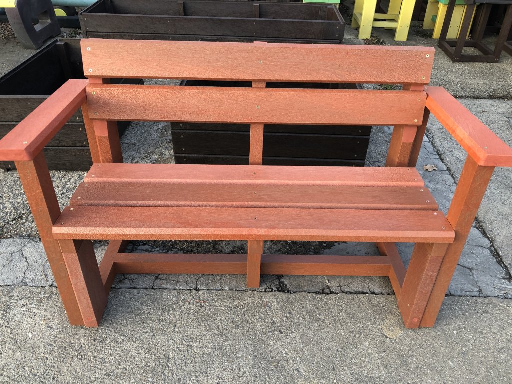 02 bb. Plastic, brick coloured bench with back and arm rests, 120 cm