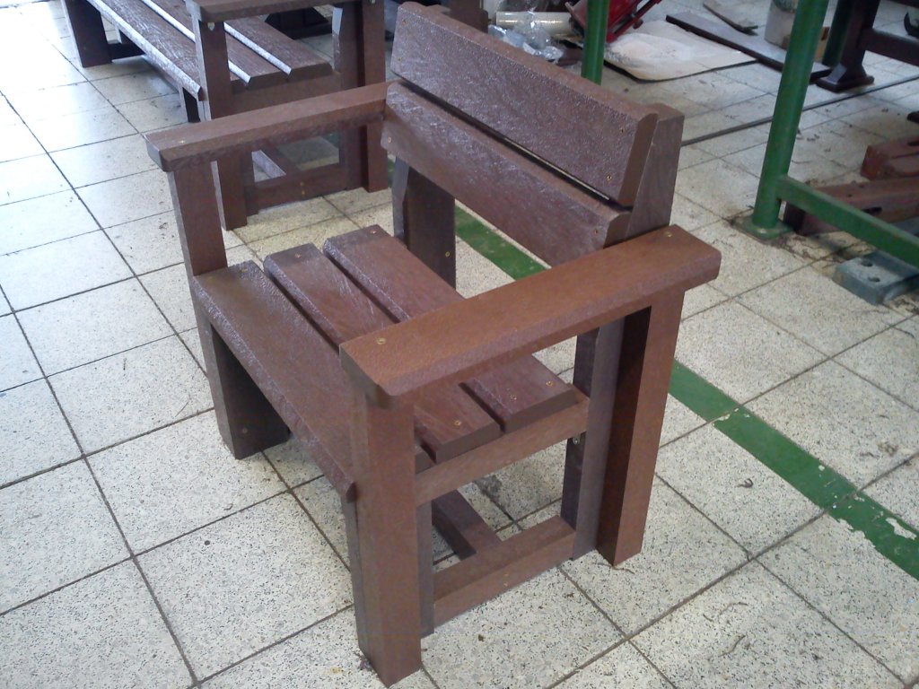 Solid armchair with armrests made of recycled material, weather-resistant. Three 3.5 cm thick boards on the seat and two 3.5 cm thick boards on the armrest. Colour brown, of course other colour variants are possible at extra cost.