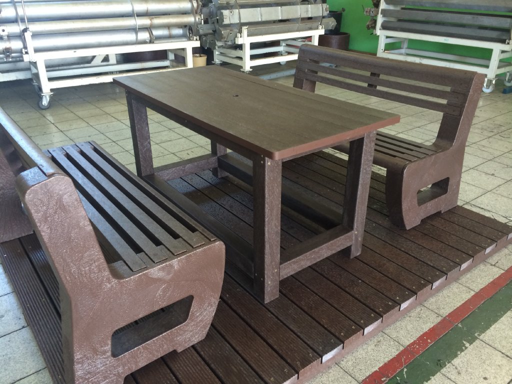 02 ga. Set of 2 solid L-bench benches and a table