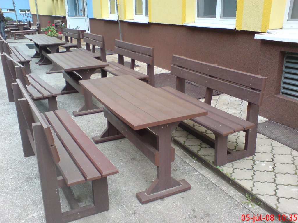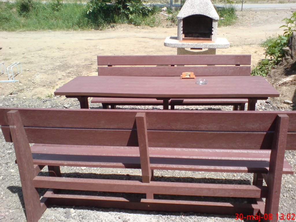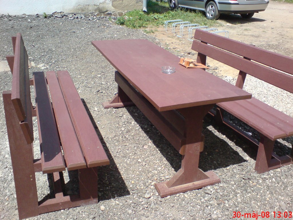 The garden furniture consists of two benches and a table. The material is weather-resistant and permanent. It is possible to choose several variants, for example a classic table with two "legs" and two benches with a backrest. We also produce various other products for seating, such as armchairs with armrests, or small tables without armrests, etc. The possibility of choosing the colour design according to the customer's requirements.
