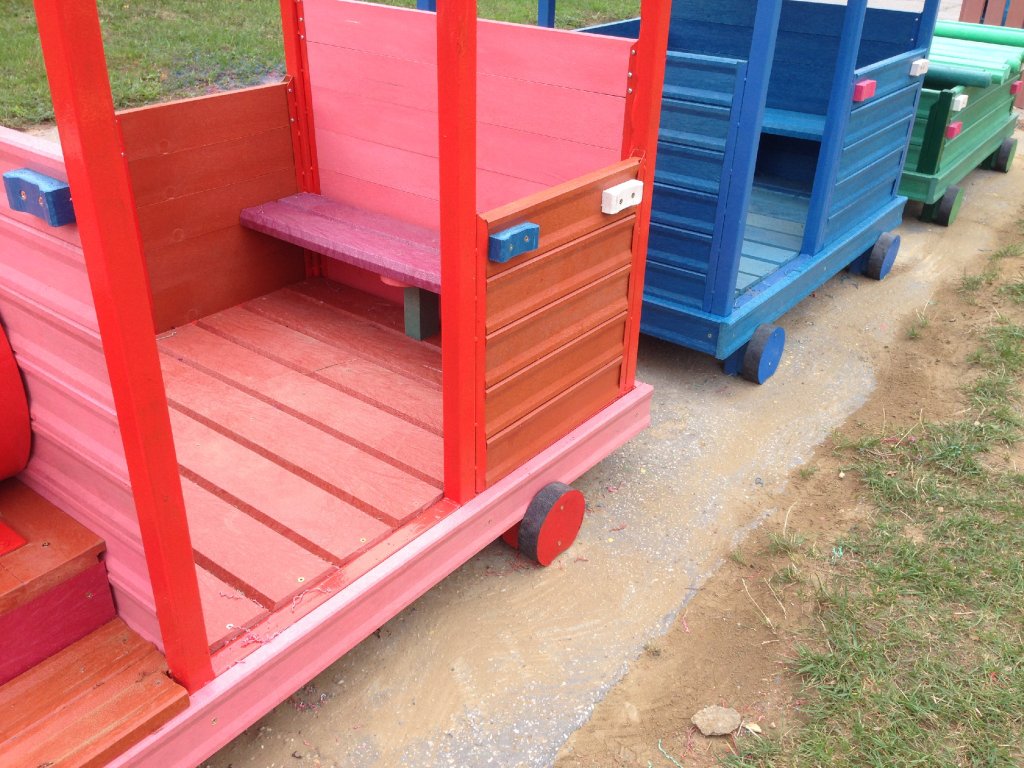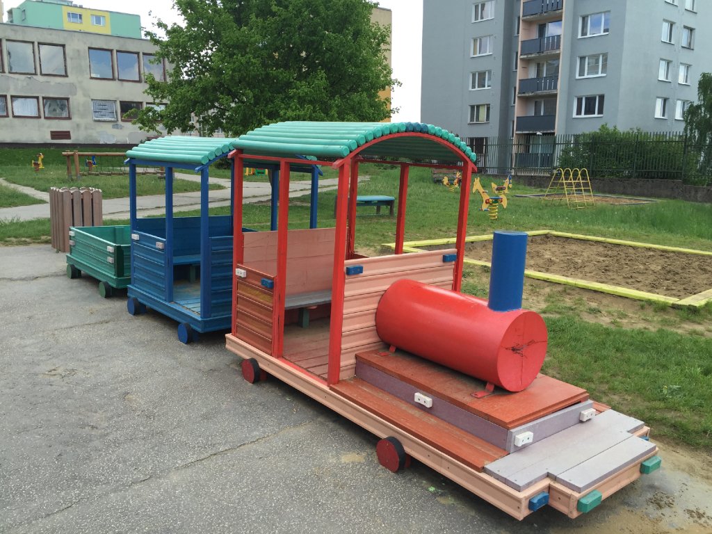 The children's train is a suitable addition to schoolyards. We can manufacture locomotives and wagons individually according to the customer's request. There are many options for making a completely new train with a locomotive and carriages, or cheaper girders that are suitable for seating. Reconstruction - or the exchange of an old wooden train for new wooden or plastic boards is also in our production program.