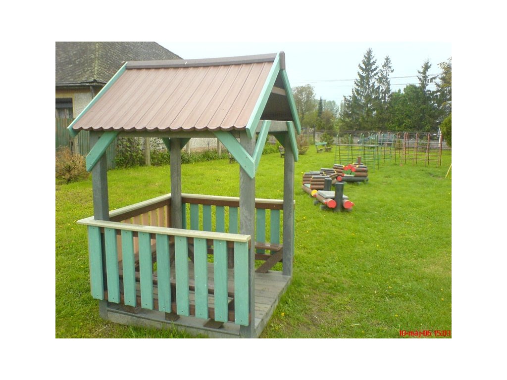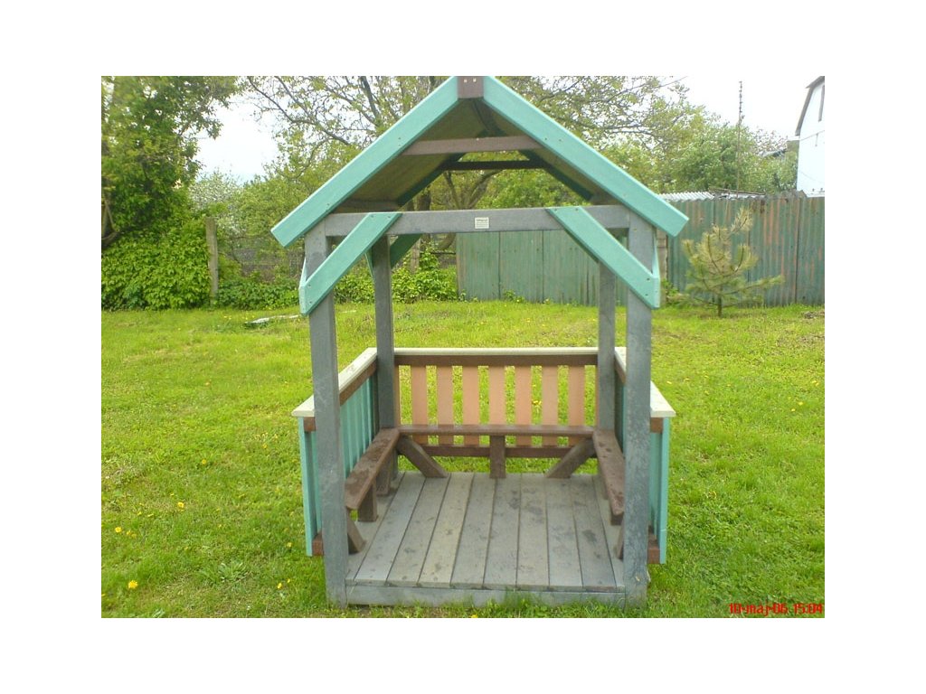 children's gazebo or a small house as a simple addition to the school yard or even more precise with a floor and benches inside. The variety of colors is relatively rich, or for the classics we use a brown shade. The house can be part of another element in the yard, possibly extended by a slide or other play element. The material is strong, colourfast, maintenance-free and weather-resistant.