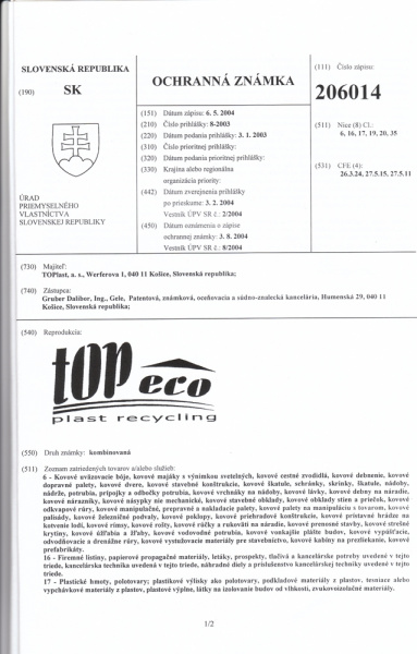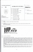 TOPeco trademark registration certificate, 100% recyclable material and all products made from them. Protocol issued by the Technical and Testing Institute