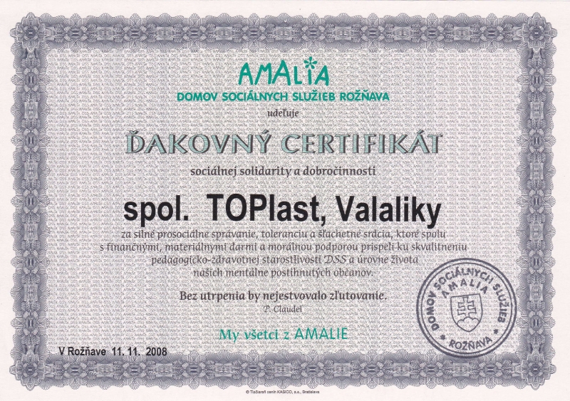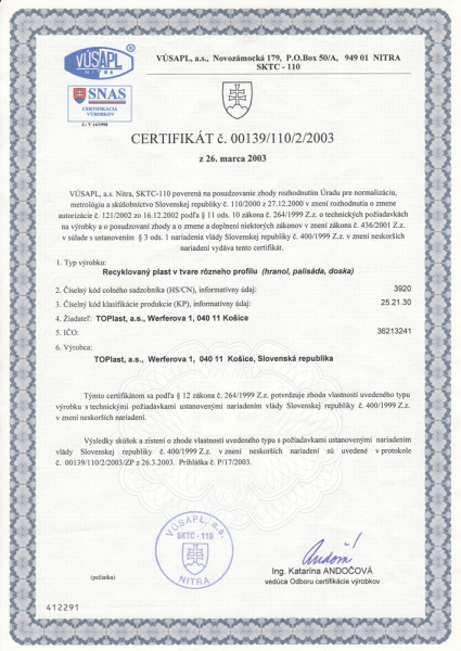 The company owns certificates issued by VÚSAPL, TOPeco trademark - TM trade mark, several test reports, tests of various