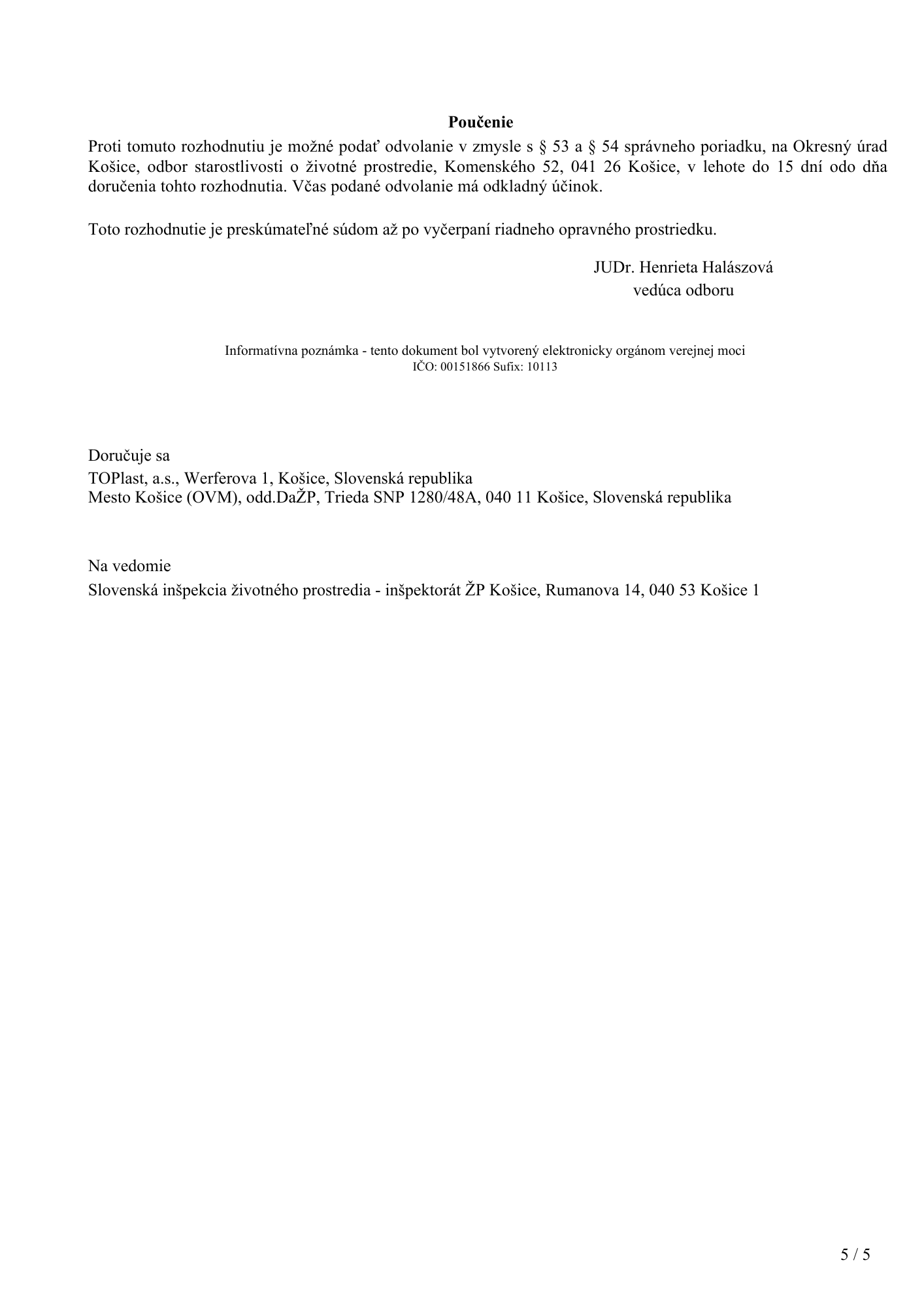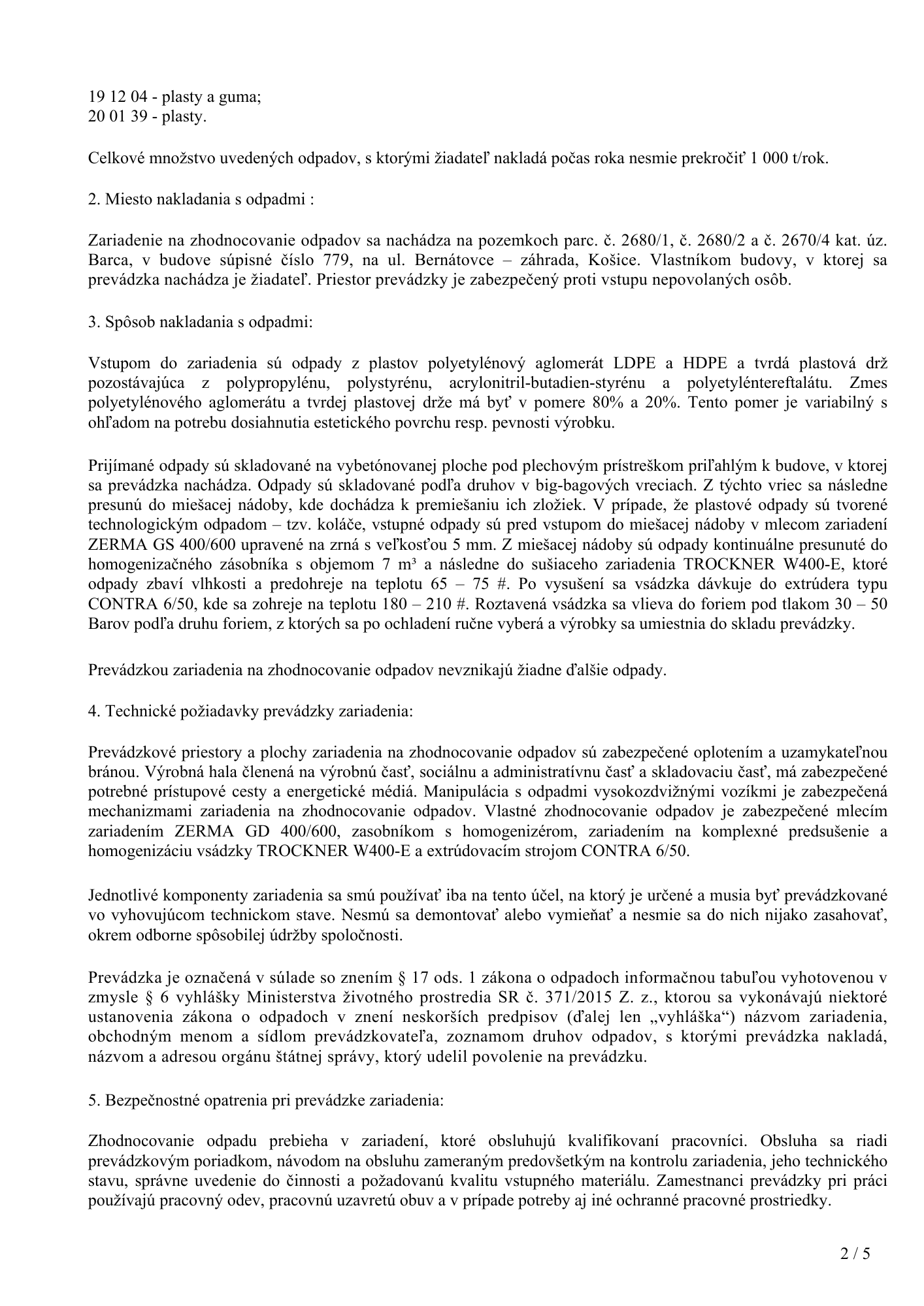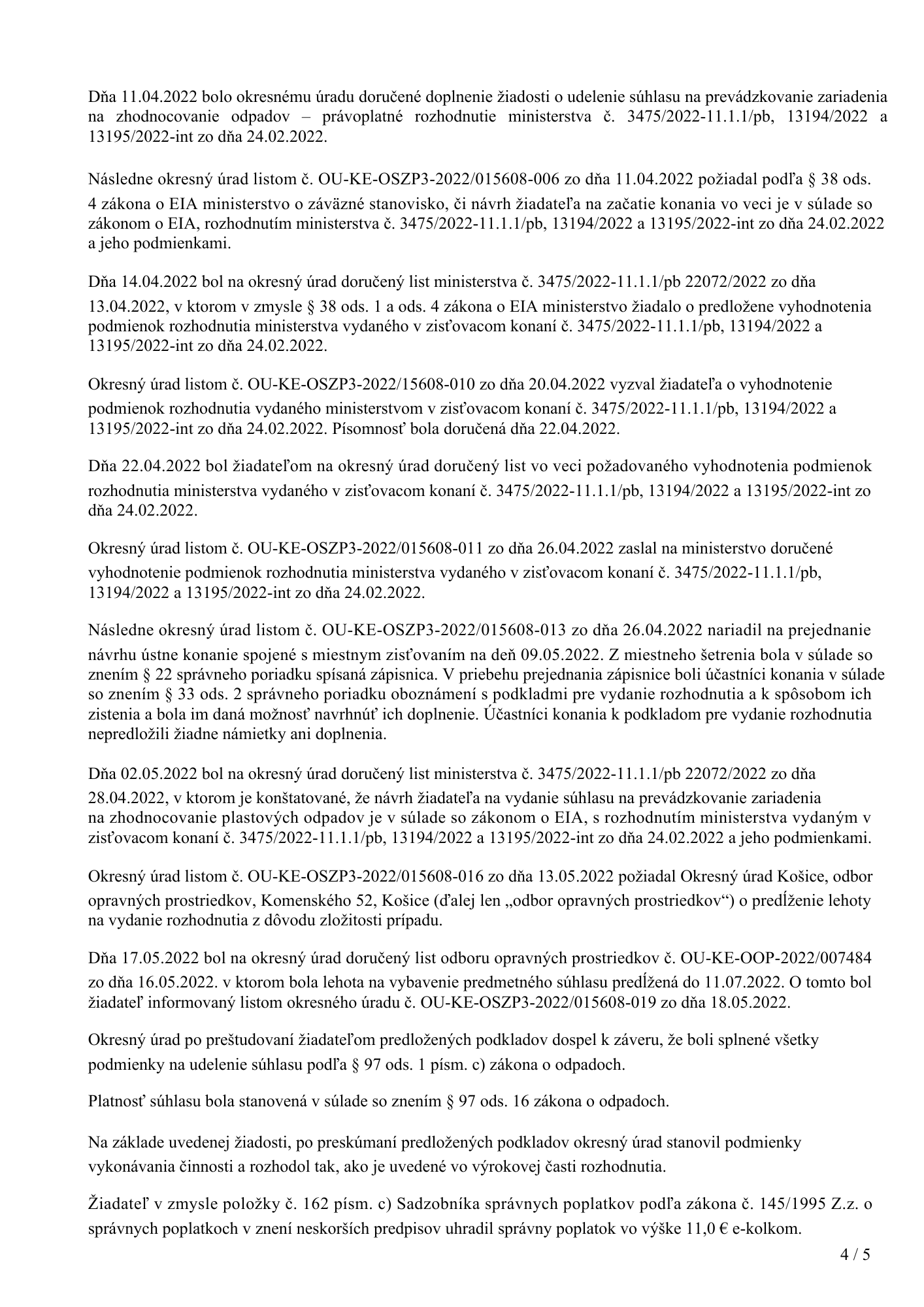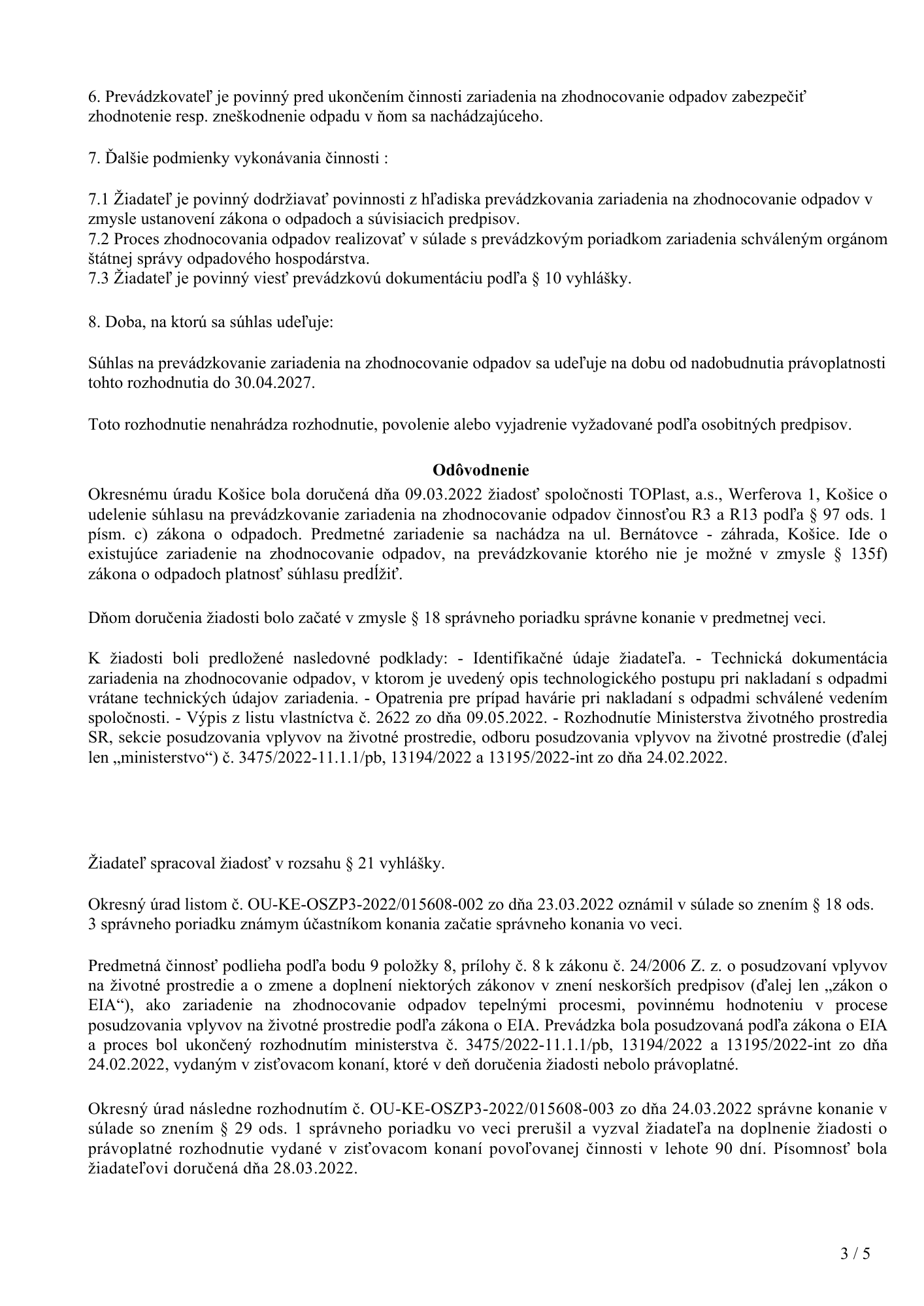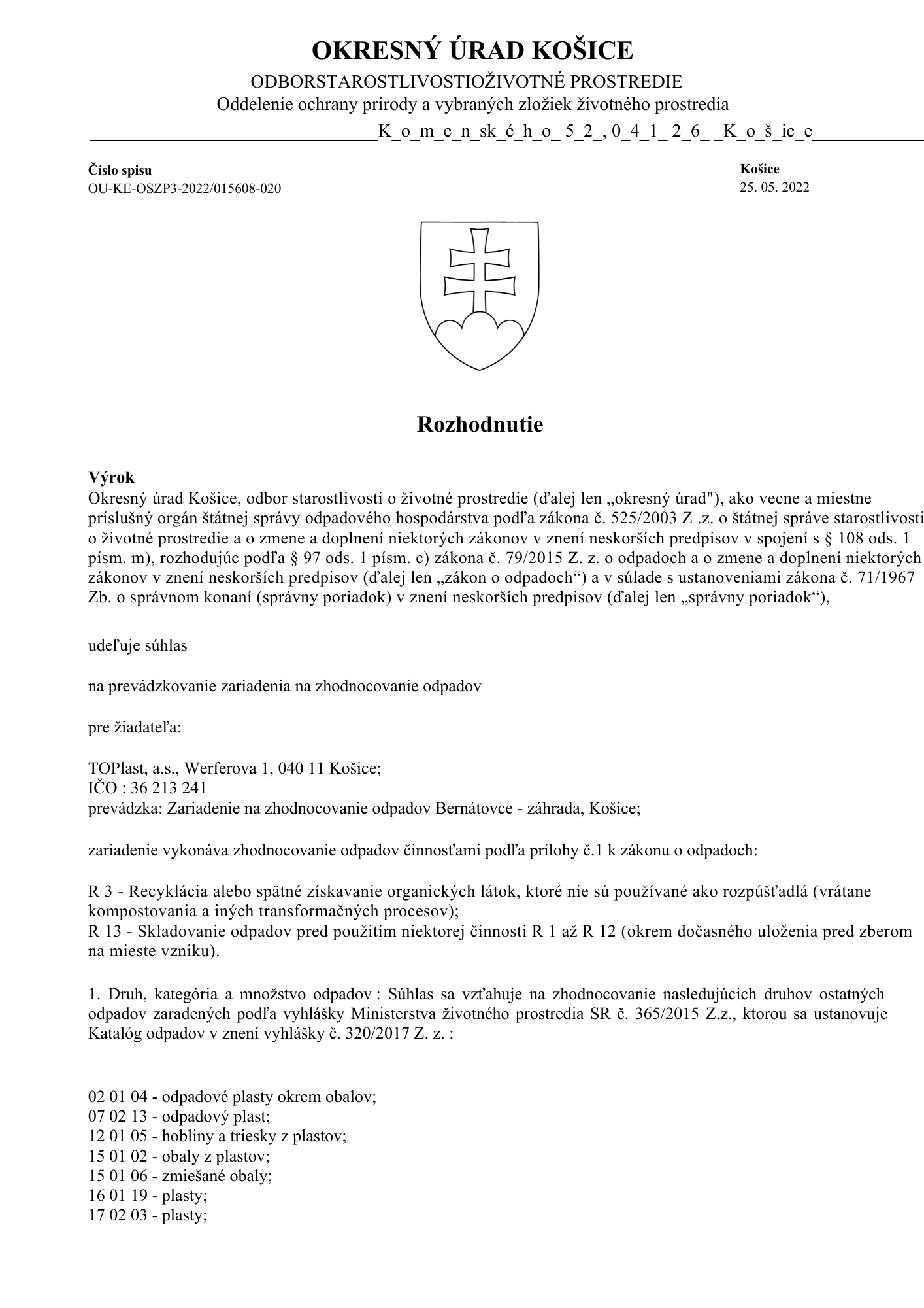 Povolenie na prevádzkovanie zariadenia na zhodnocovanie odpadov od OKRESNÝ ÚRAD KOŠICE, ODBOR STAROSTLIVOSTI O ŽIVOTNÉ PROSTREDIE, Oddelenie ochrany prírody a vybraných zložiek životného prostredia udelené dňa 25.5.2022 s platnosťou do 30.4.2027: